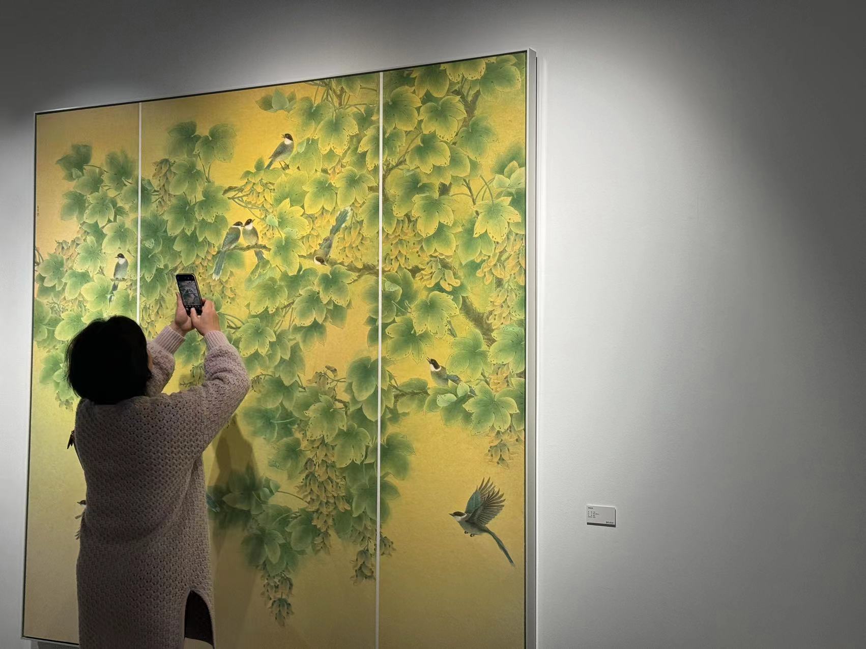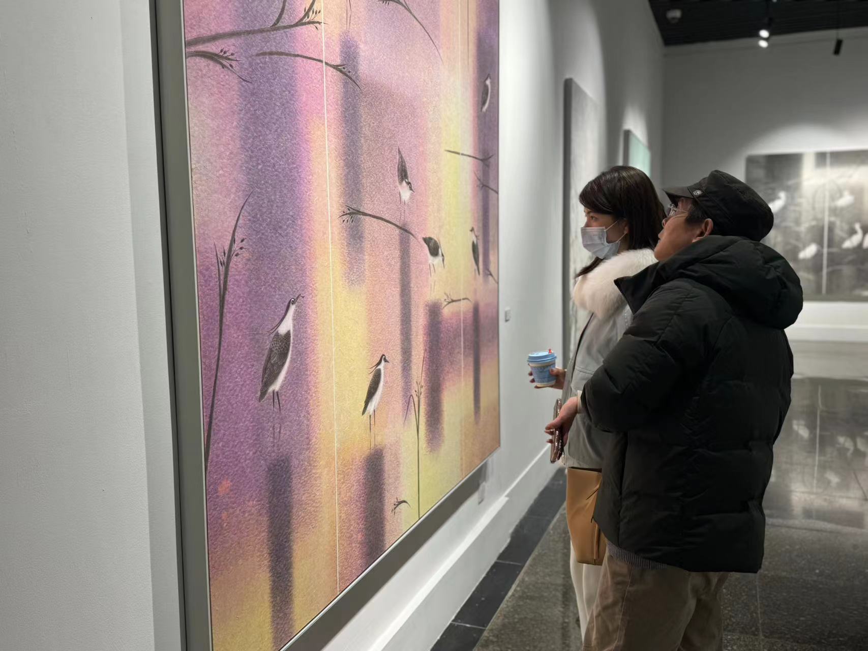 “希望通过此次展览唤起大家对生活、对自然的热爱,在大都市中追求内心的宁静。”万芾说,自己在中国美院学习时学的是装潢设计专业,所以在绘画中希望融入新的设计理念,以点、线、面的抽象元素处理画面,在传承的基础上进行创新。由于小时候长期在农村生活,接触自然非常多,特别喜欢花草鸟兽。进入专业学习后,她专攻花鸟画,自己也养鸟养花,她的画中便常常出现小鸟、花草等元素,丰富画中自然与生命的含义。而在画面背景中,她喜欢融入城市的倒影,通过窗格的表现、灯光的闪烁等,形成波光粼粼、水光潋滟的效果,形成画面的冲击力。也希望由此让观众感悟热爱自然、珍爱生命,追求美好生活的愿望。