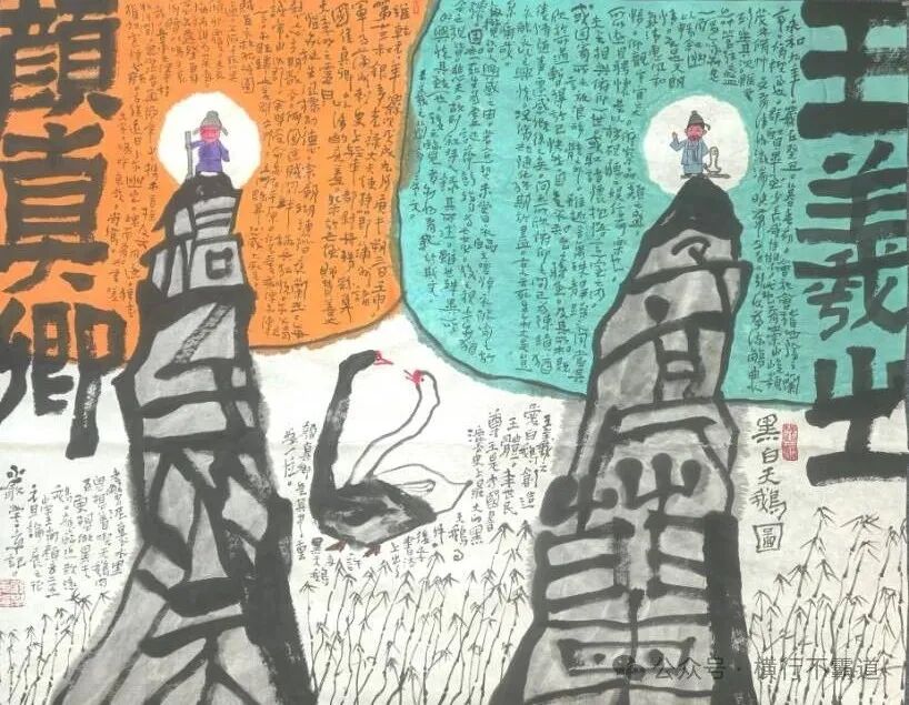 我把画作初稿,放在同修微信群里,征求画的名字,有人提议叫“二圣图”,有人提议叫“双峰图”,而我坚持叫《黑白天鹅图》。在我看来,王羲之与颜真卿,王是白天鹅,颜是黑天鹅,两者构成了中国书法史的太极图。王代表阴柔美,颜代表阳刚美,王是书圣,颜也是书圣,勿论孰高孰低,都是中国的国宝,临沂的市宝,更是老蟹心中的心肝宝贝。