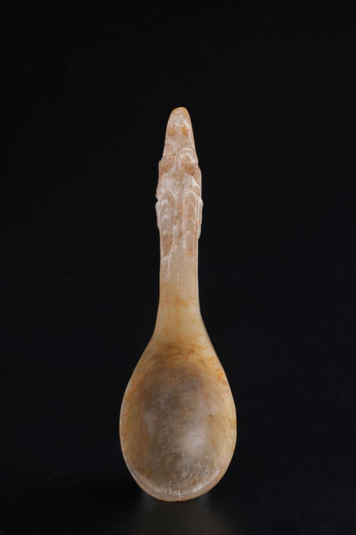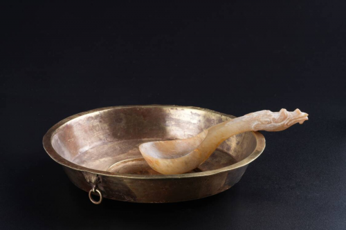 此拍品由白玉龙首匙及银质鎏金铺首洗两件组成,匙以整料白玉雕刻,质地晶莹细腻,雕龙首为端,龙首长角卷曲,粗眉圆目,姿态威严,令匙显得更雍容华贵。