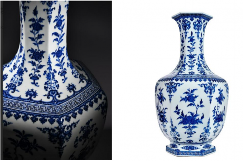 是次中国艺术品拍卖以清乾隆贡御青花折枝花果巴洛克式六方大尊领衔,此瓶整体呈六方形,侈口长 颈,折肩弧腹,圈足外撇作台阶状,器形端正大气,通体以青花描绘,瓶颈部六面分饰折枝花卉,腹部 主体以「三多」为主题纹饰,寓意「多子」、「多福」、「多寿」,祥花瑞果,穷秀极妍,吉祥之气尽现。 底部青花书有《大清乾隆年制》六字三行篆书款,此类青花花卉纹六方瓶始于雍正年间,流行于乾隆前 期,后期则不再生产。根据清宫档案记录,即使在乾隆早期的御瓷中,同类型的器物也极为稀少,最多 不过十余对,制作难度极高,贡品数量亦十分有限。此器非常适合用作殿堂陈设,曾经置于清宫内外的 重要皇家场所,实属弥足珍贵。