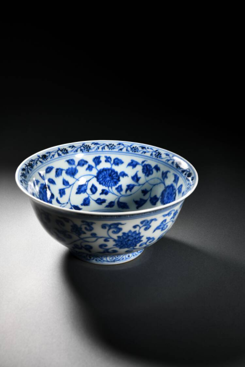 另一亮点为明宣德青花缠枝四季花卉纹盌,其花卉纹描绘四季花卉盛放争艳,浓淡青花点染花卉,笔道劲捷有力,写意捕捉枝叶芳华之姿,亭亭玉立,跃然眼前,纹饰布局舒朗大方,细节精妙巧致,釉色洁白莹亮,与青花相互辉映,尽显宣德官瓷之美。 如此精湛之画工属宣窑之最,常得后代仿效,但没有相类者。