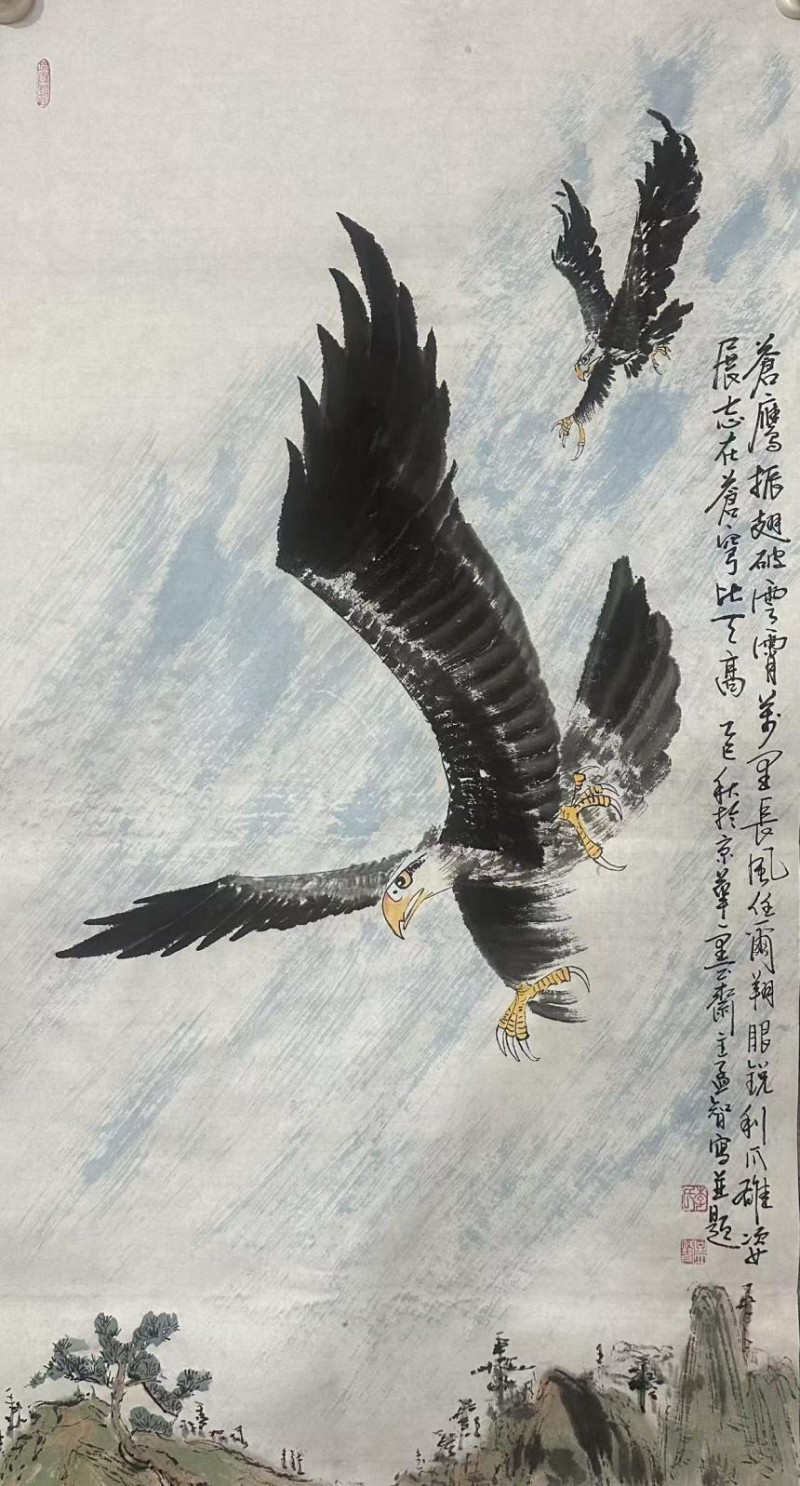 以书入画,笔走龙蛇,墨舞云烟,李孟智之书画,以书为骨,以画为魂,如鲲鹏借风,抟扶摇而凌太虚。其书,或苍劲如鹰隼之喙,啄破鸿蒙;或流转似莲茎之柔,萦绕清塘。其画,鹰击长空则骨力尽显,荷绽池塘则气韵悠然,书之笔法融于画之形神,如泉入溪,浑然无间。