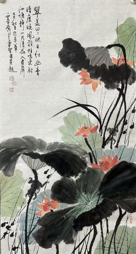 赏其荷卷,墨色如行书之潇洒,泼洒荷叶则浓淡相宜,勾描花脉则细腻如丝,宛若仕女浣纱,柔美与雅致共生。那荷叶之润、荷花之娇,尽得书法之韵味,让清莲之韵,溢满卷间,似文人作书时之意气,行云流水,沁人心脾。