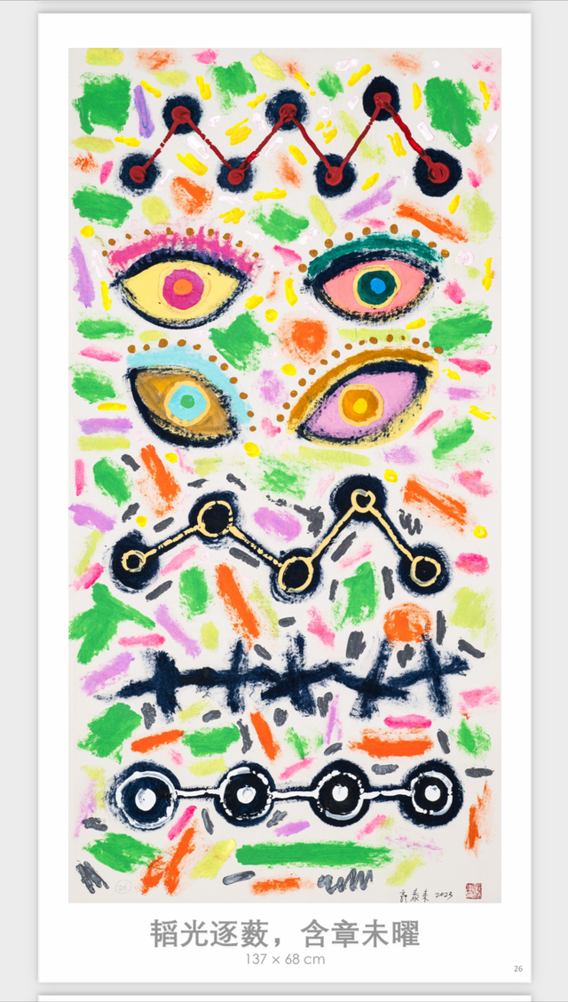 以流动之线条,勾勒烛龙睁眼、饕餮吞光之瞬,将远古图腾融入当代审美肌理。每一笔彩墨的晕染都暗合经文中的方位与神谕,在虚实之间重构东方奇幻宇宙。纹样非徒再现神话形象,乃提取其精神内核,借色彩振动频率与构图张力,传递天地初开之时的能量脉动。作品既保留了甲骨文字的神秘质感,又融入现代视觉节奏,使古老叙事在当下焕发新的感知维度。
