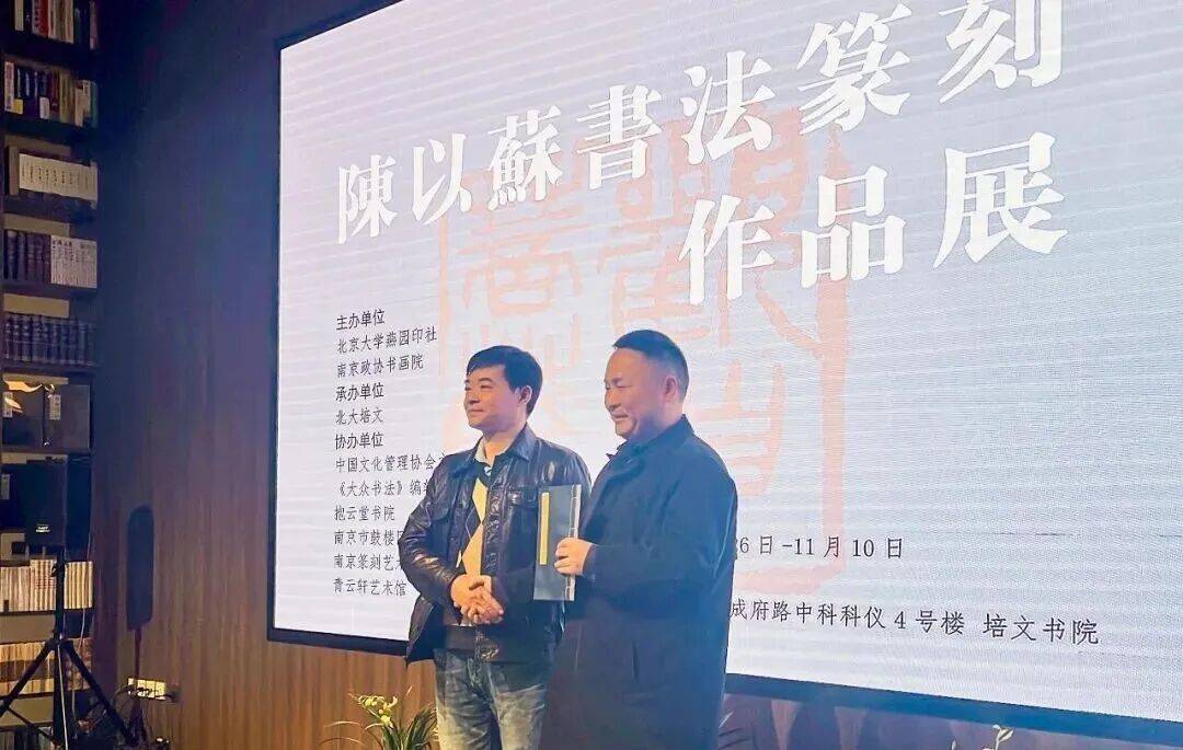 开幕式上,陈以苏向承办方北大培文捐赠了其精品力作《周其凤十二生肖组诗》与《心经印谱》,由北大培文投资集团董事长李小波先生代表接受。