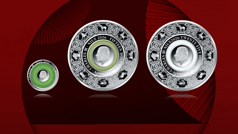 “金马奔腾”马年贺岁纪念钞,以连体钞、整版纯银大炮筒形式呈现。正面五花宝驹与牡丹缠枝团纹相伴,寓意富贵荣华,并巧妙藏百福于花中。背面呈现查尔斯三世肖像与灯笼、锦鲤、聚宝盆等吉祥元素,象征财运亨通、幸福安康,并以微雕防伪工艺展现“百福化一”,凝聚祥瑞之意,尽显典藏价值。
