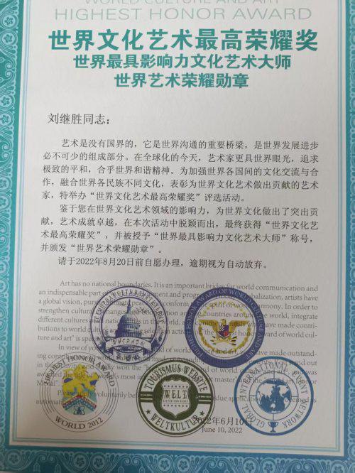多年来,刘继胜的艺术成就硕果累累,令人瞩目。他曾60多次参加国内国际书画大奖赛,荣获特别金奖6次,金奖(含一等奖)17次,二、三等奖更是数不胜数 。《金笔奖》《金龙奖》《金蛇奖》《金羊奖》《金像奖》《金铂奖》《百花奖》等书画艺术类最高奖纷纷收入囊中,此外,他还斩获了《首届中国文人奖》《文化艺术最高成就奖》《齐白石国际艺术金奖》等一系列极具分量的奖项。这些荣誉,不仅是对他艺术才华的高度认可,更是他艺术生涯中的一座座丰碑。