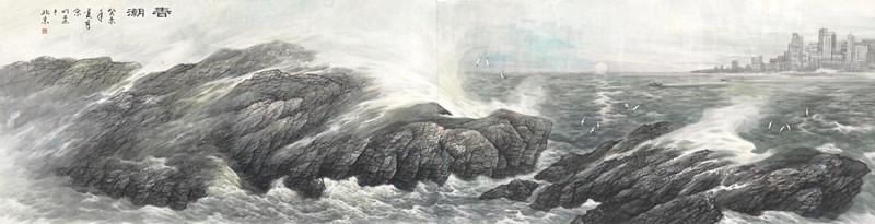 审视中国画发展史,一个新画科的成立需要具备四个基本条件:题材的独立性、表现手法的创新性、绘画材料的传承性以及传统文脉的延续性。宋明远先生创立的海洋画科,恰恰在这四个维度上都实现了突破与平衡。他以海洋要素为特定表现对象,将传统山水画中作为点缀的水元素提升为主体,完成了绘画题材的根本性转换。这种转换不是简单的对象替换,而是观察视角和表现重心的彻底变革——从“以山为主,水为辅”的陆地视角,转向“以水为主,山为点缀”的海洋视角。