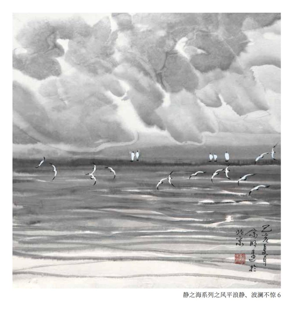 宋明远将传统山水画的“三远法” 转化应用于海洋画创作而形成“三阔法”的理念,即水平方向的开阔:主要表现海洋在横向上的广袤无垠,呈现出海平面向两边无尽延展的辽阔态势,展现大海宽广的规模与宏大的空间感。纵深方向的壮阔:主要表现海洋在纵深层面的深邃神秘,静水深流,让观赏者感受到海洋在深度上的不可测以及幽远的意境。时间维度的恒阔:传达出大海始终处于变动不居、奔腾不息的永恒特性,凸显海洋蕴含的无尽生命力。这种“无岸之海”的满构图画面,令观者生发出心旷神怡的沉浸式的视觉体验。