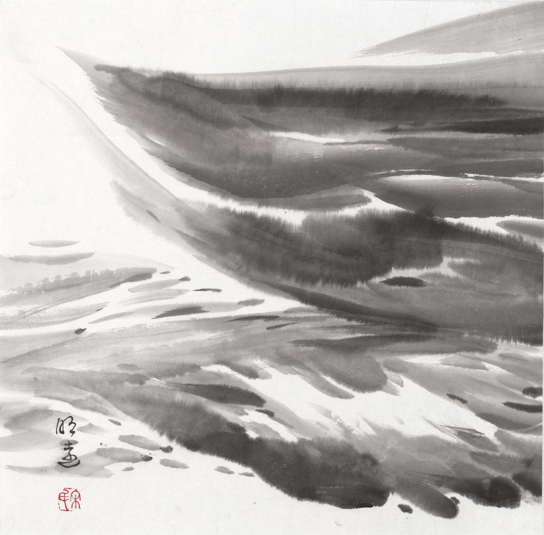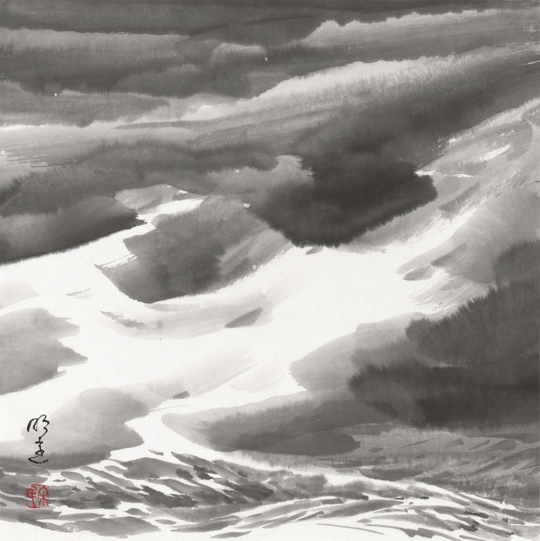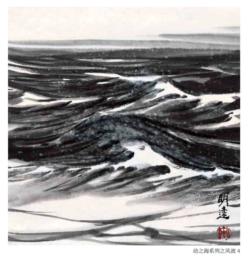 中国画对水的表现,可追溯到新石器时代。其彩陶纹饰中,以简洁质朴的线条加以表现。秦汉壁画、帛画中,多以曲线、折线象征河流、水波,服务于整体叙事。魏晋至隋唐,山水画从人物画中独立出来,水的表现依旧附属于山,仍以线的表现为主。东晋顾恺之的《洛神赋图》、隋朝展子虔的《游春图》等作品都以线条勾勒水纹形态。唐宋时期,随着山水画的成熟,水的表现愈加精细,呈式化表现为主要特征,最具代表性的是南宋《马远水》十二图,用线条精密表现水波纹、细浪等形态,这是中国画历史上画水的第一座高峰。元明清时期,水墨写意画兴盛,水的表现在留白和极简线条上进一步探索,依旧呈现出较为程式化的表现形态。近现代画家打破传统范式,将西方绘画的光影、透视与传统笔墨结合,拓展了水的表现维度。比如徐悲鸿、傅抱石在表现江河、瀑布时,融入写实元素,增强了水的体积感和力量感。当代以专门画海为己任的宋明远,专题聚焦海洋这一宏大水体,继承传统,中西合碧,创新发展,创造出一系列表现海水的技法,其笔下的海水磅礴、深邃、浩瀚、汹涌,形态变幻莫测,气势惊天动地,把水的表现从传统的江河湖泊,扭转面向更广阔的海洋,其成书于公元2025年的《宋明远海水画谱》,以五百图的容量,赋予海水题材的新时代特质与文化内涵,与时代审美同步,铸就中国画历史上画水的又一座高峰。