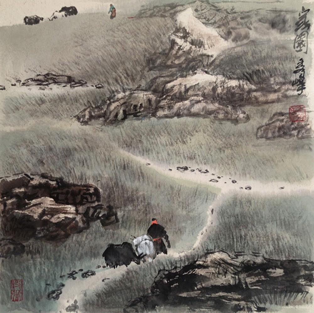 最动人的,是她山水中的“人味”。不同于传统山水画中“人如芥子”的疏离,李秀峰的山水里,人物从不是点缀,而是山水的灵魂。牧民策马奔腾,马蹄踏碎草原的寂静;老者静坐坡前,目光与远山相融,仿佛在与天地对话。人物的姿态舒展自然,与山石、草木、流云相映成趣,没有丝毫违和。她以细腻的笔墨勾勒人物的神情,又以磅礴的气势铺展山水的辽阔,一细一阔间,道出了“天人合一”的东方哲思——山水滋养人,人亦赋予山水生机与温度。