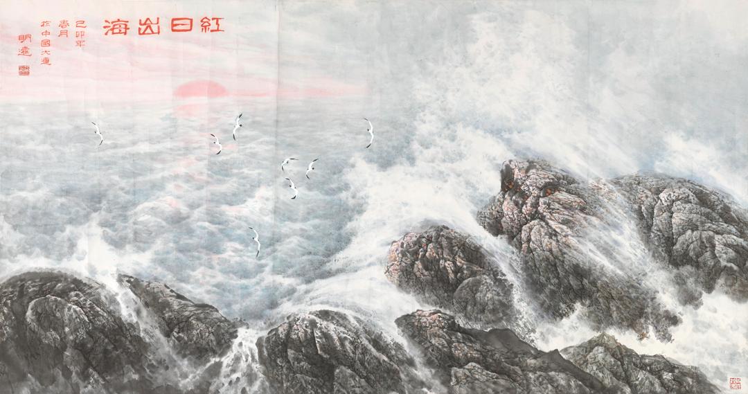 首先对东方海洋美学(绘画)体系哲学基础的厘定。在长期创作实践中,他逐步提炼出东方海洋美学(绘画)体系是以“天人合一”“海纳百川,有容乃大”为核心理念,将海洋视为与天地、人类共生的有机整体,而非需征服的对象。这是以儒家“中和”、道家“自然”与佛家“禅意”三大思想体系为基础的哲学思考。海洋的辽阔象征“胸怀天下”的格局,将其转化为家国情怀、人际和谐的寄托,体现“中和之道”下的人文关怀,这是儒家视角。海洋是“道”的具象化,如“上善若水”,以海洋的包容、流动、顺应自然,喻指“无为而治”“与自然共生”的境界,这是道家视角。海洋的空阔、潮起潮落对应“心性空明”与“世事无常”,引导人在观海时体悟“宁静超脱”,消解人与外界的对立,这是佛家视角。这些理念形成了兼具形而上的思考和现实关怀的海洋哲学观。