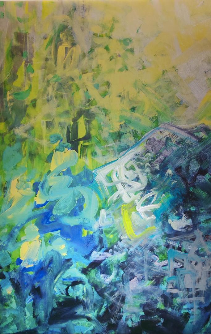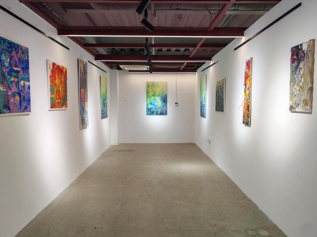 第三幕“星丛”, 是“绽放”的宇宙,也是是 “会心”与“生成” 的宇宙。长廊里悬挂的四时五行,时空穿梭中抵达核心星体旋涡,这里展示的“重彩画面”,有丙烯有油画也有中国彩墨,标志着一种崭新本体的诞生——我们称之为 “心象山水” 。它已非风景画,而是一种精神的能量拓扑。画面中,色彩与肌理的碰撞、流淌与控制,形成了一种春夏秋冬内在的引力场。这既呼应了德勒兹所言“感觉的逻辑”,是让不可见的情感与时间变得可见;更深层次上,它回归了徐复观先生所阐释的“中国艺术精神”——艺术最终是主体生命境界的迹化。邵老师的贡献在于,他用全球当代艺术通用的材料与抽象语言,诠释并延展了这一东方美学的核心命题。