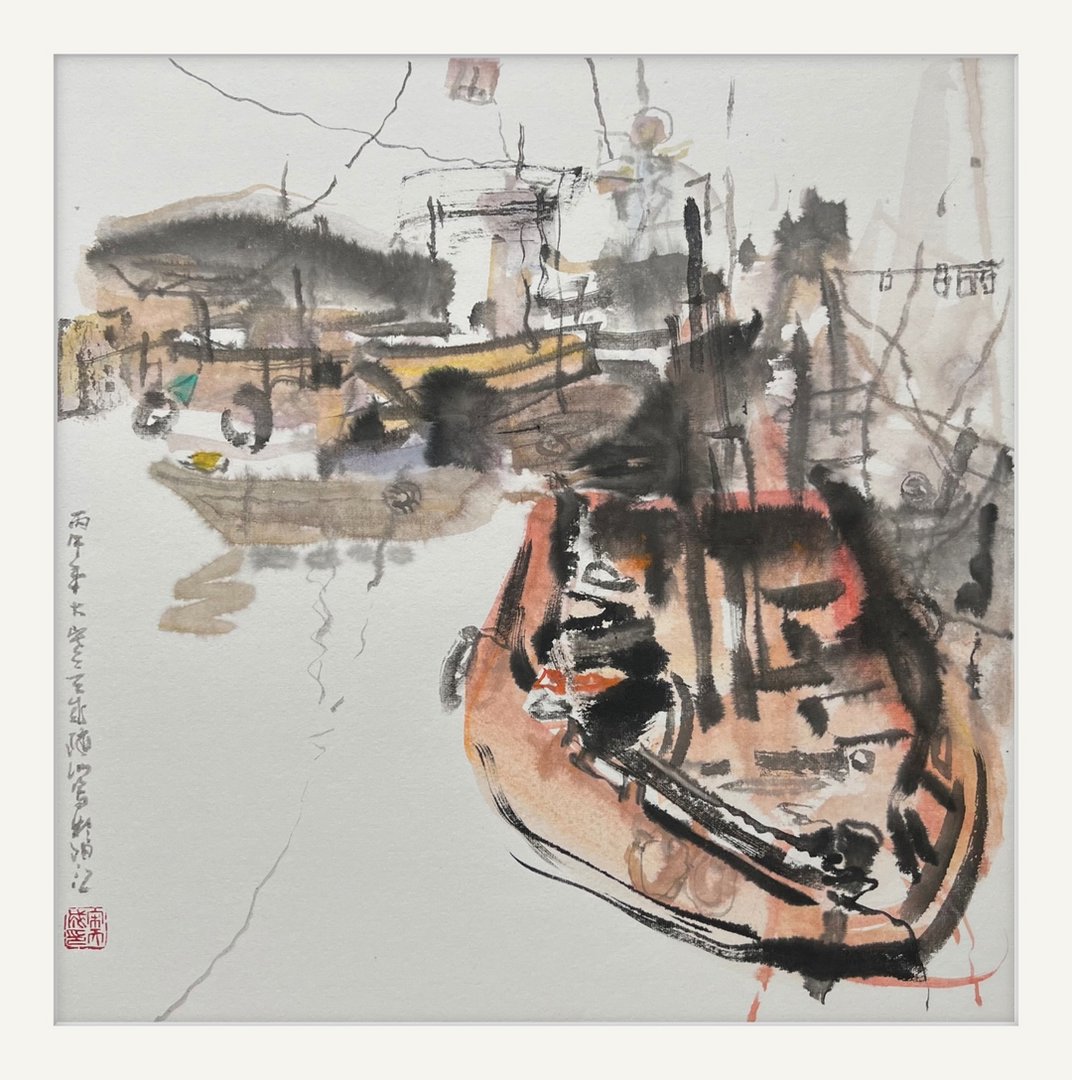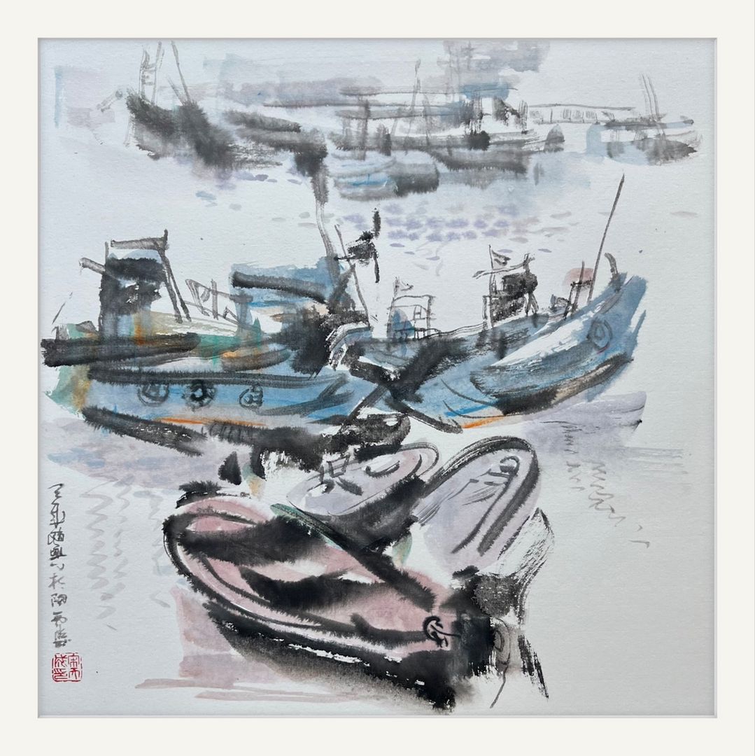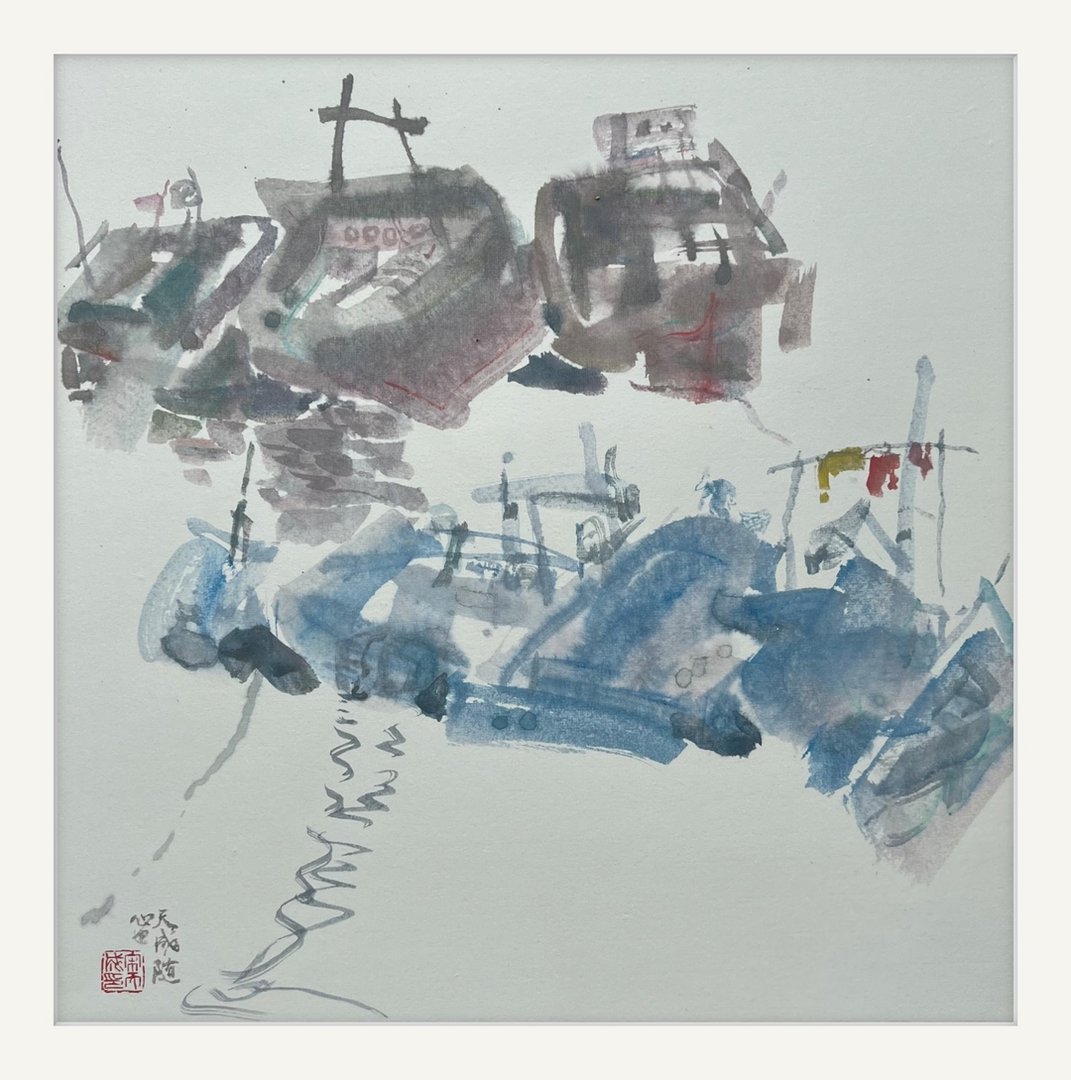 船舰交错重叠、竞相延展,钢架高低错落、形色妖艳,桅杆鳞次栉比、形如利箭,缆绳六色五颜、纵横纠缠;浪花乱飞,光照四溅,马达轰鸣,笛声震天;渔歌悠闲,哨音袅艳。每一艘舟楫,每一根桅杆,每一方舵盘,每一个渔人都成为了这片海域不可或缺的构件。然而,只要你屏心静气,就会发现如此“混沌”中竟然裹挟着某种超乎寻常的能量,亦或一种蓬勃向上的生命活力。是的,这种“乱”并非真乱,而是一种清亮的混沌,一种包蕴着无限可能的动态平衡与让人诧异于凌乱的和谐之美。假如你是艺术家,你还会看到波涛上每一个音符是如何被秩序定格,每一个影相是如何被结体,每一个色域之间的负空间是如何被赋能的。这些色块、音符、影相并未被禁锢于你的画面,它们只是很安静地排列在那里,似乎有一双大手紧紧拽住流动的空气,把眼前移动的一切稳稳当当安放在各自应有的位置。这种空间静默中的张力,让你感觉它们会由内而外爆炸开来,把眼前的一切连同你的灵魂碎裂成飘渺的虚空。其时,一个声音还会告诉你画面之外不在场的正在为如此场景的展现提供更多潜质的能量支撑。
