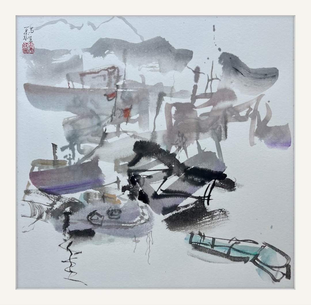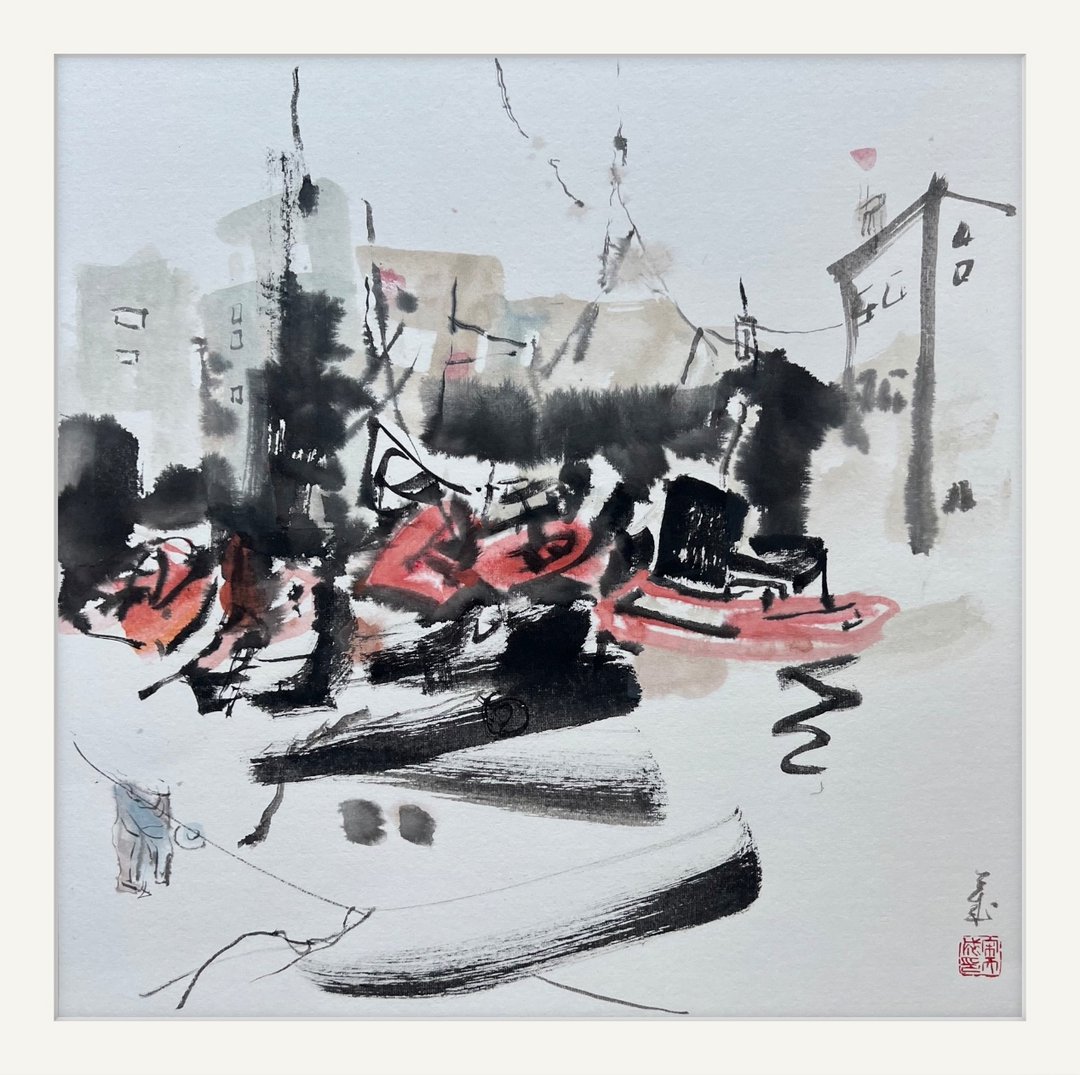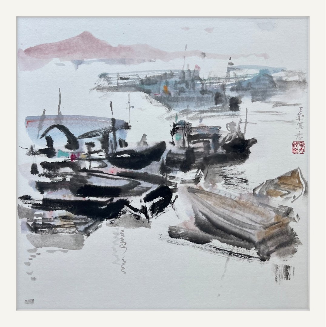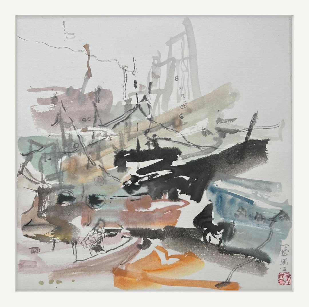 船舰交错重叠、竞相延展,钢架高低错落、形色妖艳,桅杆鳞次栉比、形如利箭,缆绳六色五颜、纵横纠缠;浪花乱飞,光照四溅,马达轰鸣,笛声震天;渔歌悠闲,哨音袅艳。每一艘舟楫,每一根桅杆,每一方舵盘,每一个渔人都成为了这片海域不可或缺的构件。然而,只要你屏心静气,就会发现如此“混沌”中竟然裹挟着某种超乎寻常的能量,亦或一种蓬勃向上的生命活力。是的,这种“乱”并非真乱,而是一种清亮的混沌,一种包蕴着无限可能的动态平衡与让人诧异于凌乱的和谐之美。假如你是艺术家,你还会看到波涛上每一个音符是如何被秩序定格,每一个影相是如何被结体,每一个色域之间的负空间是如何被赋能的。这些色块、音符、影相并未被禁锢于你的画面,它们只是很安静地排列在那里,似乎有一双大手紧紧拽住流动的空气,把眼前移动的一切稳稳当当安放在各自应有的位置。这种空间静默中的张力,让你感觉它们会由内而外爆炸开来,把眼前的一切连同你的灵魂碎裂成飘渺的虚空。其时,一个声音还会告诉你画面之外不在场的正在为如此场景的展现提供更多潜质的能量支撑。