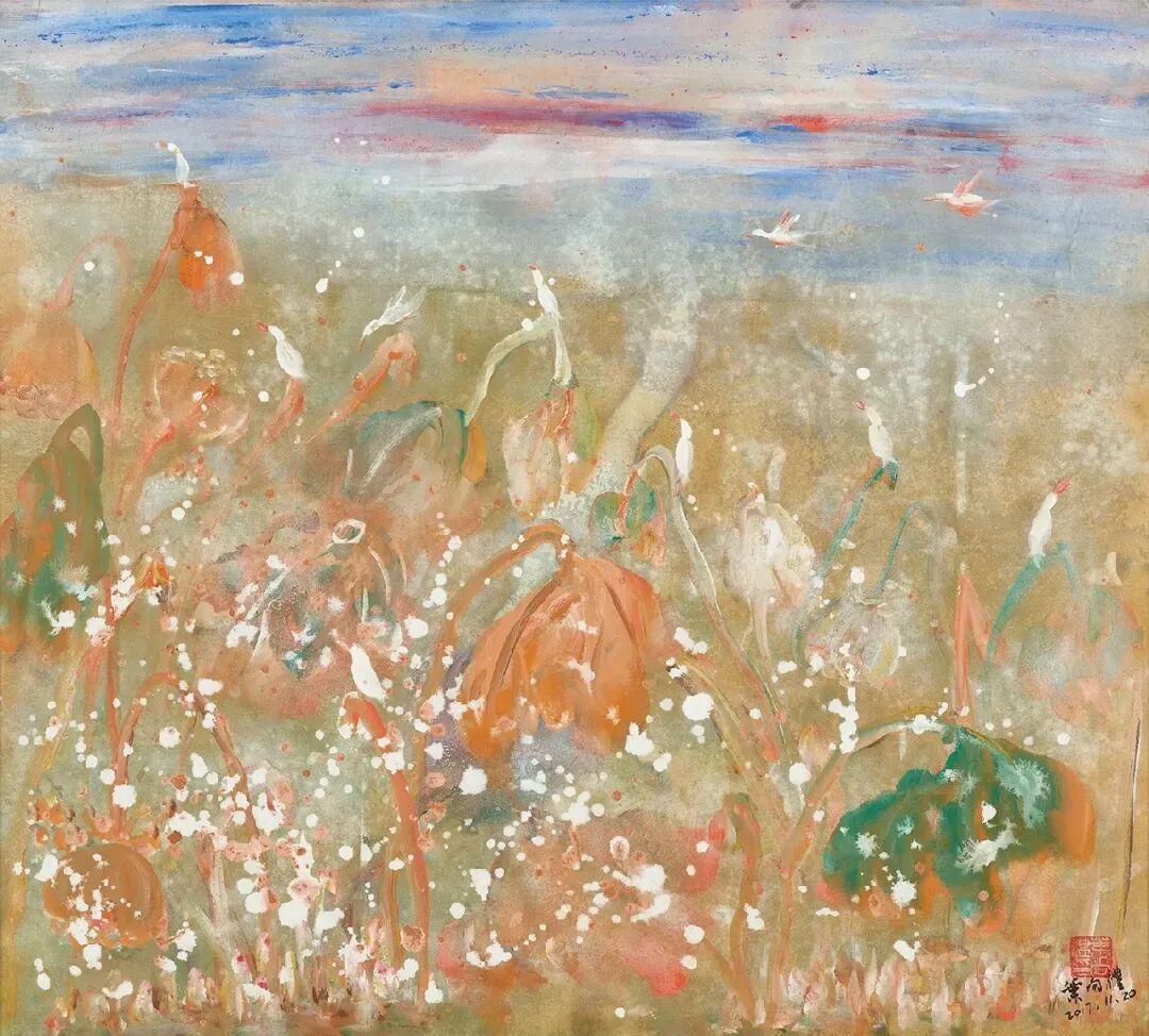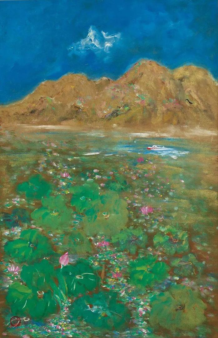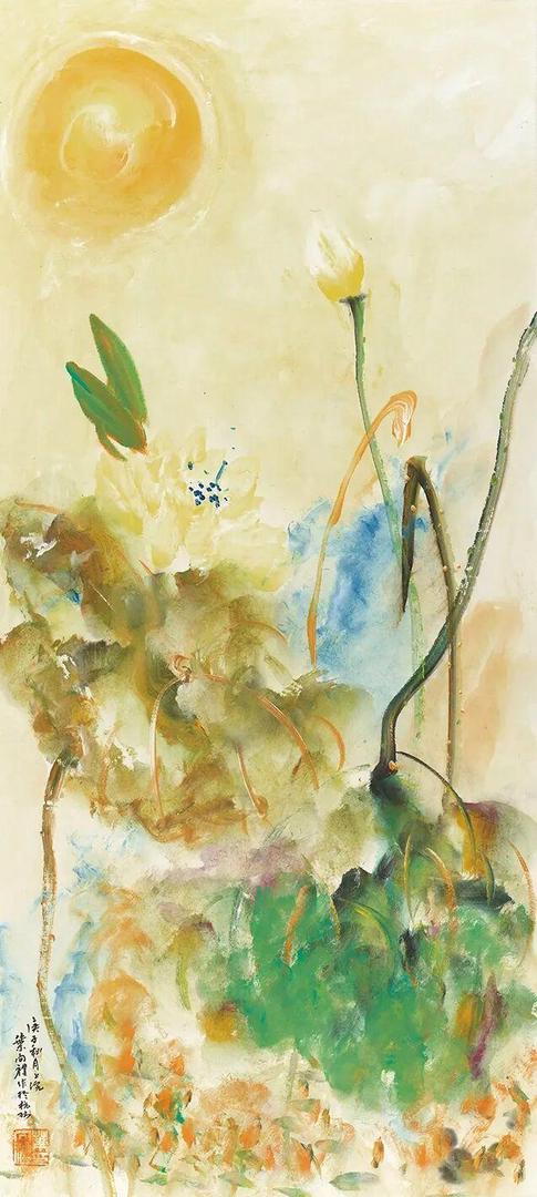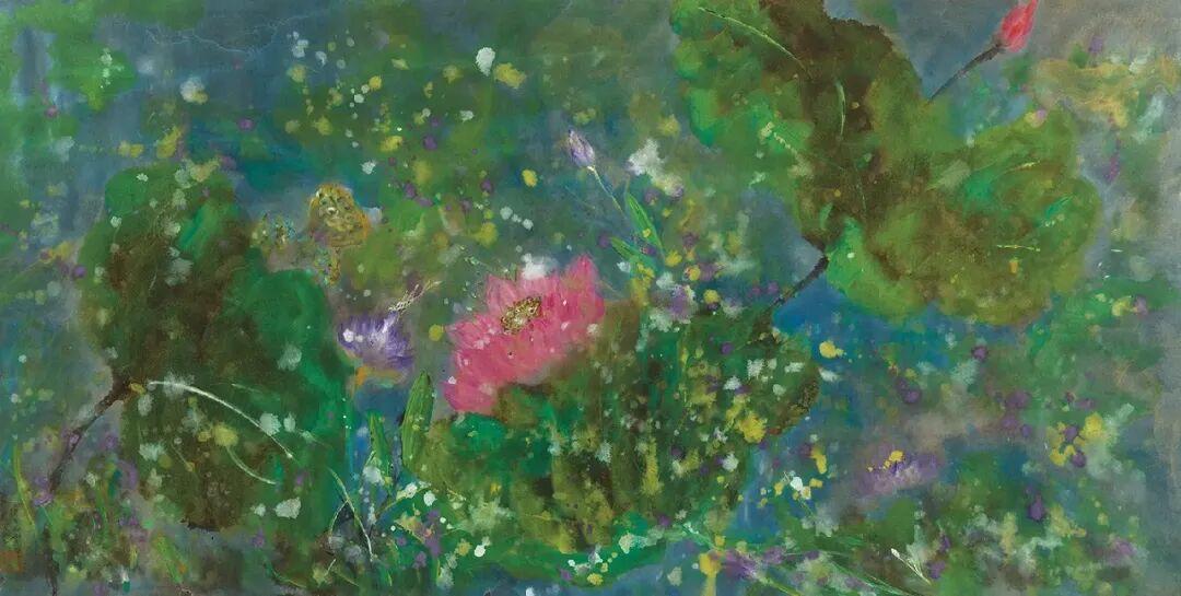 他和夏荷做深深地对话,又奔放地在炎热的阳光下画夏荷的歲蕤,是人的精神和大自然“映日荷花别样红”的相呼相映,这种西湖盛夏之美是炙热的、洋溢的,亦为神飞的。于是画的多彩变换是阳光移动和水波流动的交响乐,也是我们这个盛世时代的一份大美写照。
