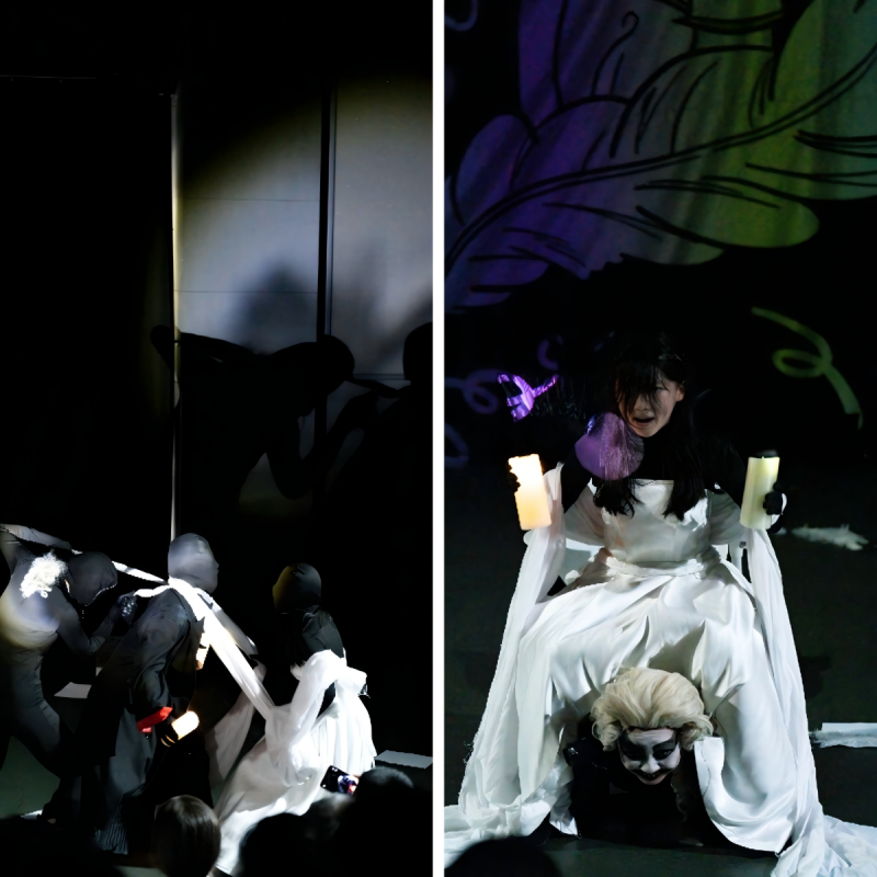 舞台视觉方面,侯莹珏导演选用全场赛事中设计复杂度最高的舞美方案,将极简哥特的冷峻克制与东方诗意美学完美融合,光影层次丰富,隐喻表达饱满,精准烘托整部剧的悲剧气质。在侯莹珏导演的全局统筹与精细调度之下,团队协作默契有序,于规定3分钟时限内,高效完成撤景与置景全流程,转场衔接流畅自然,尽显出色的现场统筹与全局把控能力。