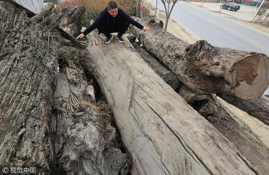 图为雕刻师胡小波查看他存放在院子的巨型阴沉木。