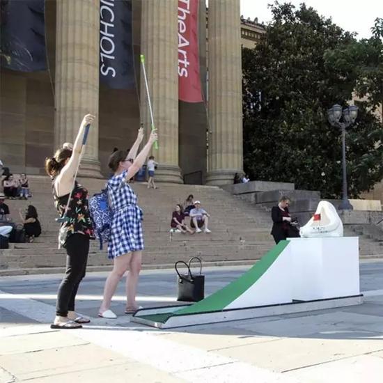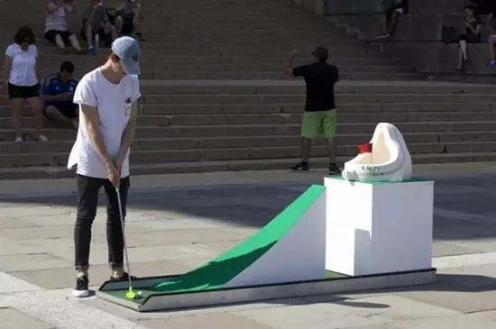 游客在费城美术馆前试玩“小便池”模样的高尔夫模拟器