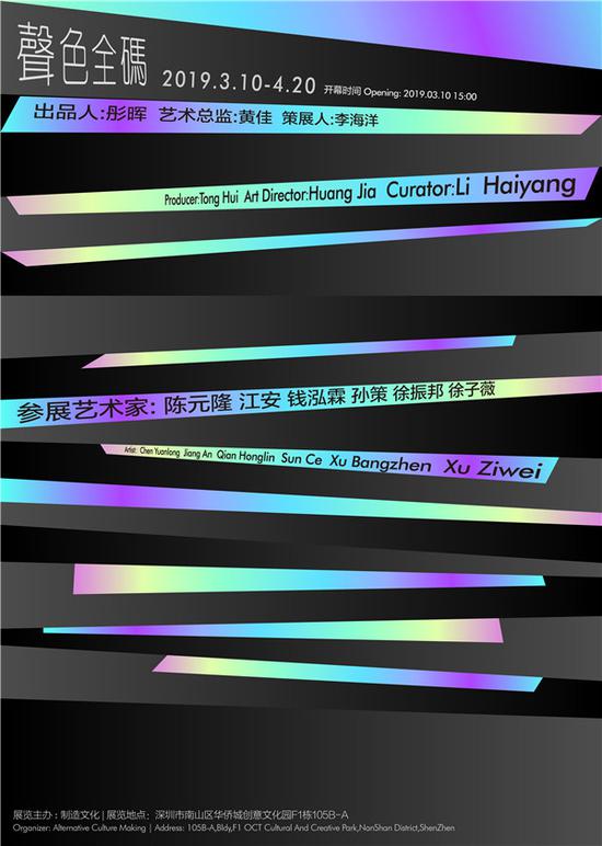 3月10日,“声色全码”艺术展在深圳制造文化空间开幕。本次展览呈现陈元隆、江安、钱泓霖、孙策、徐振邦、徐子薇六位青年艺术家的最新作品。作品涉及新媒体、装置和平面绘画,呈现出艺术家对当下社会发展带来的问题进行追溯与反思。