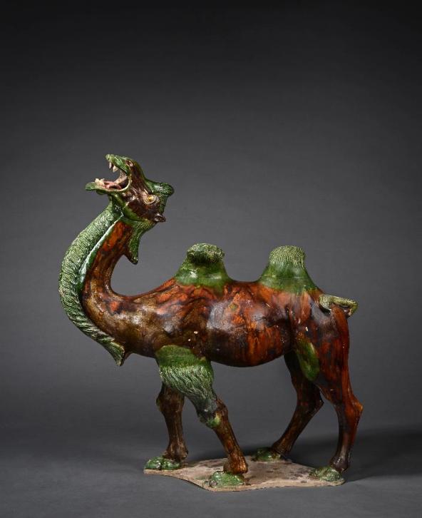 骆驼昂首阔步、姿态雄健,定格了丝路生命的昂扬瞬间,仿佛引颈嘶鸣、呼唤远方的伙伴,目光坚毅,似已望见大漠尽头的长安城郭。该釉陶骆驼为清末修建铁路时出土,曾被外籍工程师携带出境,后在国际拍场现身,由陕西唐三彩艺术博物馆齐跃进馆长多轮竞价购回并促成回归展出,见证文物“回家之路”。