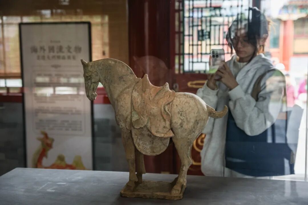 涵道斋展厅里,游客穿行于各个展柜之间,有人在唐三彩骆驼前端详其绚丽的釉色,有人在宋代青瓷旁品味清朗的器形之美,还有人拍照记录下清代黄地粉彩的吉祥意涵。