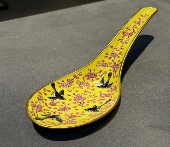 “喜上眉梢”题意鲜明,黄地显尊、粉彩精润、金彩点缀,反映晚清御窑在礼制筵器上“密而不繁、雅而不薄”的工艺追求。藏品旧藏于丹麦电报公司经理、艺术收藏家索弗斯·布莱克(1882—1960)家族,经历百年辗转,在海外华人藏家多年寻访与洽商后,于欧洲拍场竞得,回归后首次面向公众展出。