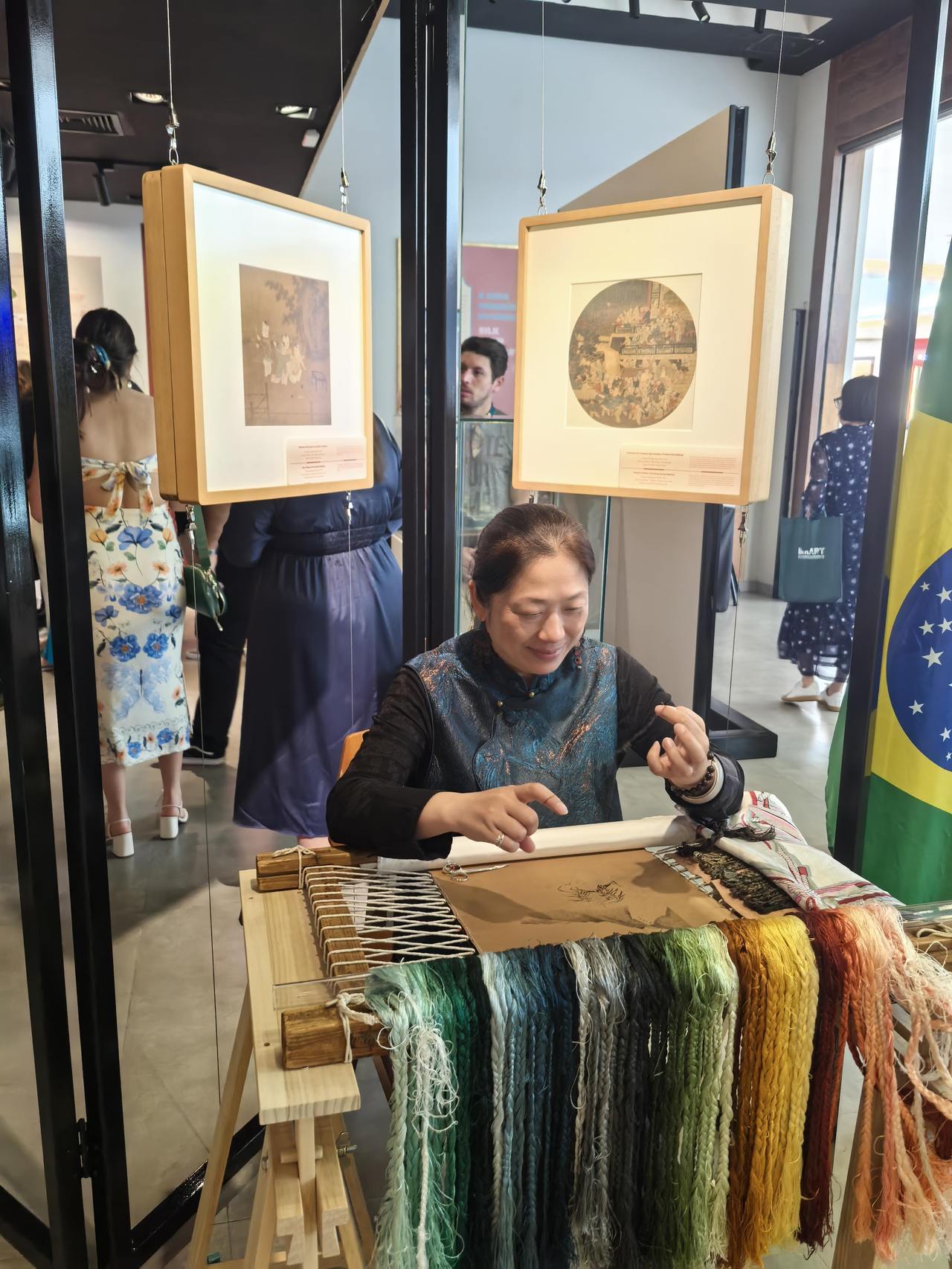 10月25日,2025“丝绸之路周”收官系列活动之“丝路绮粲:中国丝绸艺术展”在巴西伊瓜苏市举办。展览包括18件宋画复制品和入编“大系”的高清调色打样稿,《百子图》等展现宋画中的服饰,与现场服饰相映成趣。这些画作不仅见证了宋代绘画艺术的高度繁荣,也呈现出丝绸在日常生活中普及化与精致化的使用景象。展览团队还基于画中形象,复原了宋代儿童所着丝绸服饰,轻盈飘逸、纹饰雅致,使观众得以穿越时空,直观感受宋人生活美学与丝绸工艺的结合。