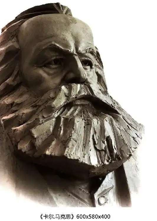 也就是“新具象”风格,具体体现在细节处理上的主观表现性。他不追求照片式的光滑复制,而是通过对泥性的保留、 刀法的走势来传递情绪。例如塑造任正非时,他通过硬边、 块面的切削感来体现企业家的坚韧与沧桑;在塑造莫言时, 则通过微妙的面部起伏及破孔捕捉文学家的敏感、深邃,通 过有鼻无孔有口难张揭示其精神磨难。