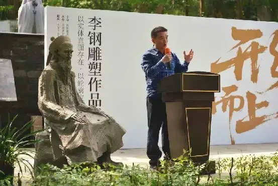 刘兆丰:今天给我的第一感觉是我们这些人坐在一起,还 有雕塑者和被雕塑者,看起来是代表了差不多半个世纪。我 们在座的可能是50后,60后,70后,刚刚走的刘道玉先生 是30后,其实我们的所有存在都是历史,今天看到的雕塑,实际上 是为一个时代而雕塑,你把它放在一起,它们会形成一个群 像,随着不同的场地,不同的机缘,他们会互相在一起,我 觉得它会更有那种时代的意义,那么这样的话,李钢做的这 些事,肯定会让大家想到当年的“贵州现象”。从尹光中的精灵古怪,到李钢的老师田世信那种拙朴野性, 再到后来进入文人气,表达对中国文化的一些关照。而李钢呢,在这条脉络上,他在贵州茁壮野蛮生长,贵州 是流放的地方,人都走了,李钢还留在这里,我们看他雕塑 的尹光中,没有粗野的原生感觉,而是表现尹光中晚年的温 和内观,我觉得贵州现象已从山野之气开始转向人文了。我 认为是非常欣喜的事情,他并没有再进一步的用那种特别夸 张的、巫的、野的东西去体现所谓的贵州特点,从根本上再 也不是民间匠人的心态,而是回到现代性的一面,这就是李 钢正在做的。李钢有双重身份,一方面,自说自话,在自我表达,另一方面接受很多委托,从某个角度来说,他是体制内的创作者,我把他的雕塑,看成是这个时代本身的胎印、印记,他就是这个时代文本本身。刚才庆武兄提到,他一些失败的东西,我觉得不叫失败, 就归入这个时代本身,但是他现代性的这种雕塑我是感受非 常非常的深。非常好的是他在同步走的时候,有二个维度和二个面向, 可以站在不同的角度看问题,有时他会倒过来,去审视,去 挑战,这个皮囊后面究竟藏着什么。在这个展览上有三件作品我是印象极深的,印象深的是我 第一次去他工作室,他在做一个小雕塑乌克兰女孩像,向乌 克兰致敬!最后取名《乌云笼罩乌克兰》。第二个是《阳明 悟道》,第三是《国士道玉》像,他第一时间发给我,他需 要知音,散热,不然自己会被内心燃起的火烧死!我觉得李钢不靠什么理论来雕塑,他是灵魂的那种,灵魂 牵引着他,他有一种天才的本能,透过皮囊看到灵魂。
