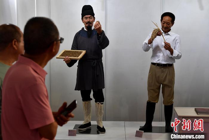 图为参观者在博览会参观展示的蜡像作品《布衣毕昇》(左)和《当代神农》。 中新网记者 张斌 摄