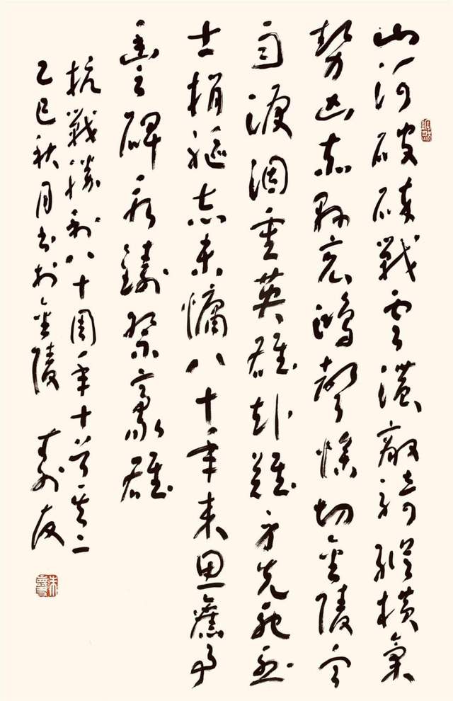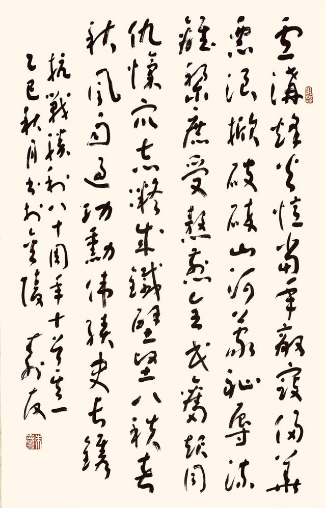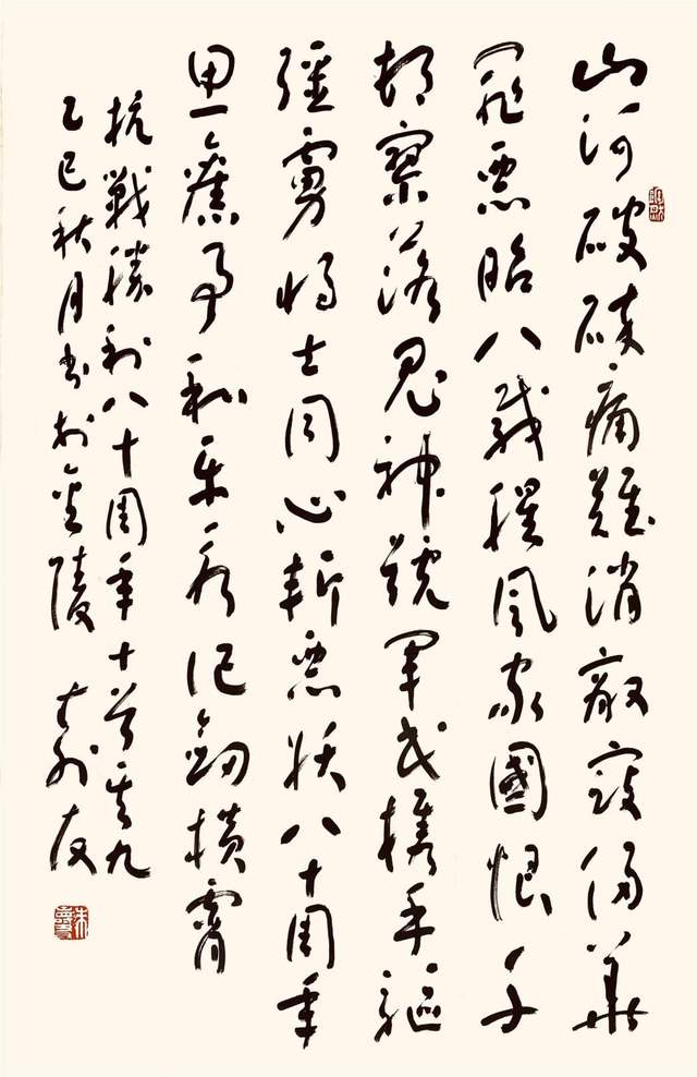 山河破碎痛难消,敌寇侵华罪恶昭。八载腥风家国恨,千村寥落鬼神号。军民携手驱强虏,将士同心斩恶妖。八十周年思旧事,和平永记剑横霄。