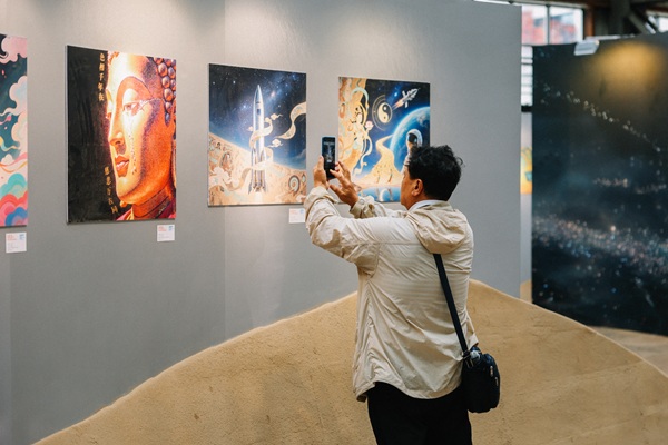 现场设置“沙粒史诗”“丝路遗韵”“宇宙探索”三大主题展区,通过沉浸式场景设计构建多元化观展体验:在敦煌沙漠氛围中追溯丝绸之路的文明脉络,于数字壁画空间中感受多元文化交融的历史积淀,置身浩瀚宇宙展开飞天神话与航天梦想的时空对话。三大展区形成一条从历史走向未来的艺术探索路径,引领观众完成跨越千年的文化体验之旅。