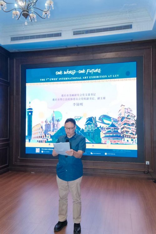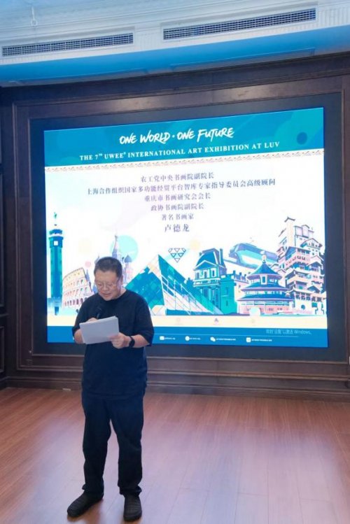 活动伊始,展览联合主办单位,重庆市书画研究会会长,重庆市政协常委,政协书画院副院长卢德龙先生在致辞中首先对出席本次活动的各界嘉宾表示热烈欢迎和衷心感谢。他指出,重庆平行展展示了重庆地区的文化底蕴和当代艺术的潜力生机,更为艺术爱好者提供了一个深入了解国际艺术的窗口,促进不同文化背景下的艺术交流。艺术无界,心连世界,他祝愿UWEE卢浮宫国际艺术展越办越好。
