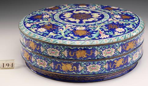 该件整体采用画珐琅工艺,盒盖外部、器身外壁以宝蓝色为底色,饰“五蝠捧寿”、缠枝西番莲间“佛八宝”、折枝花等纹样。与造办处制作的画珐琅相比,此盒纹饰活泼流畅,融合西洋技法制作而成,具有清乾隆时期广东画珐琅的典型特点。