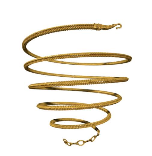 此金项饰是“南海Ⅰ号”沉船出水的第一件金器,具有明显的西亚风格。金项饰的带钩和搭扣有轻微的使用痕迹,表明它应该不是船上的货物,而是个人使用的金饰。