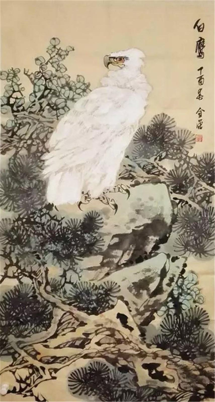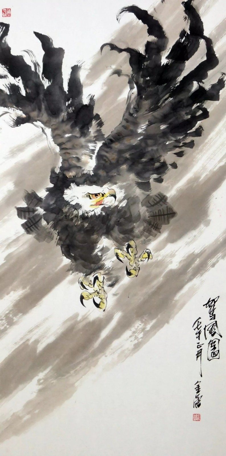 雄鹰是他喜欢的绘画题材之一,或雄踞松石,或翱翔长空。对于鹰这种动物的描绘,他笔锋犀利,纵情挥洒,整幅作品充满了刚劲的气势,在画面中用更加刚毅的线条来突出鹰的雄姿和霸气,让我们能够直观的感受雄鹰的凌烈姿态,在他的笔下,以公鸡作为主角的作品则显得充满了生活的情趣,画面柔和了许多,也更加丰富,将国画中色墨相融的技巧发挥到淋漓尽致。欣赏张金荣的国画作品,完全就是一种美的享受,是对于国画艺术的又一次膜拜。