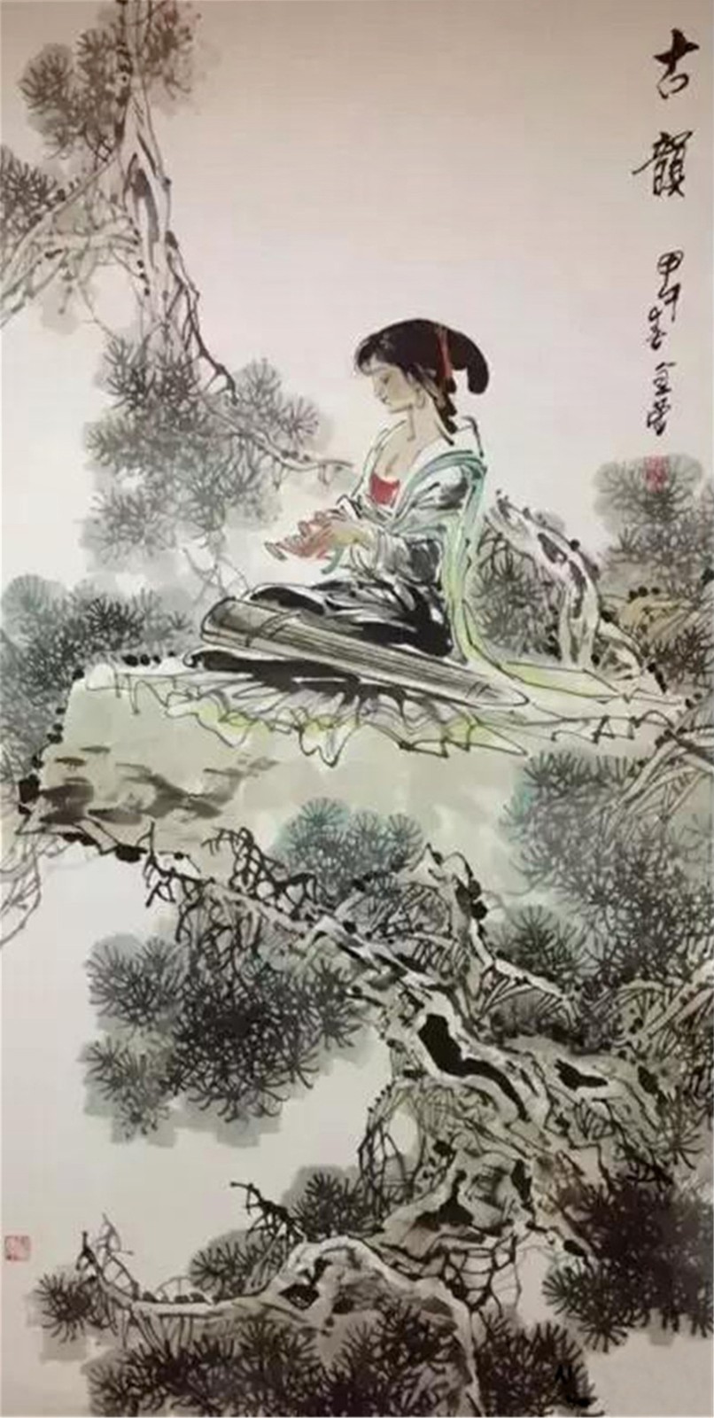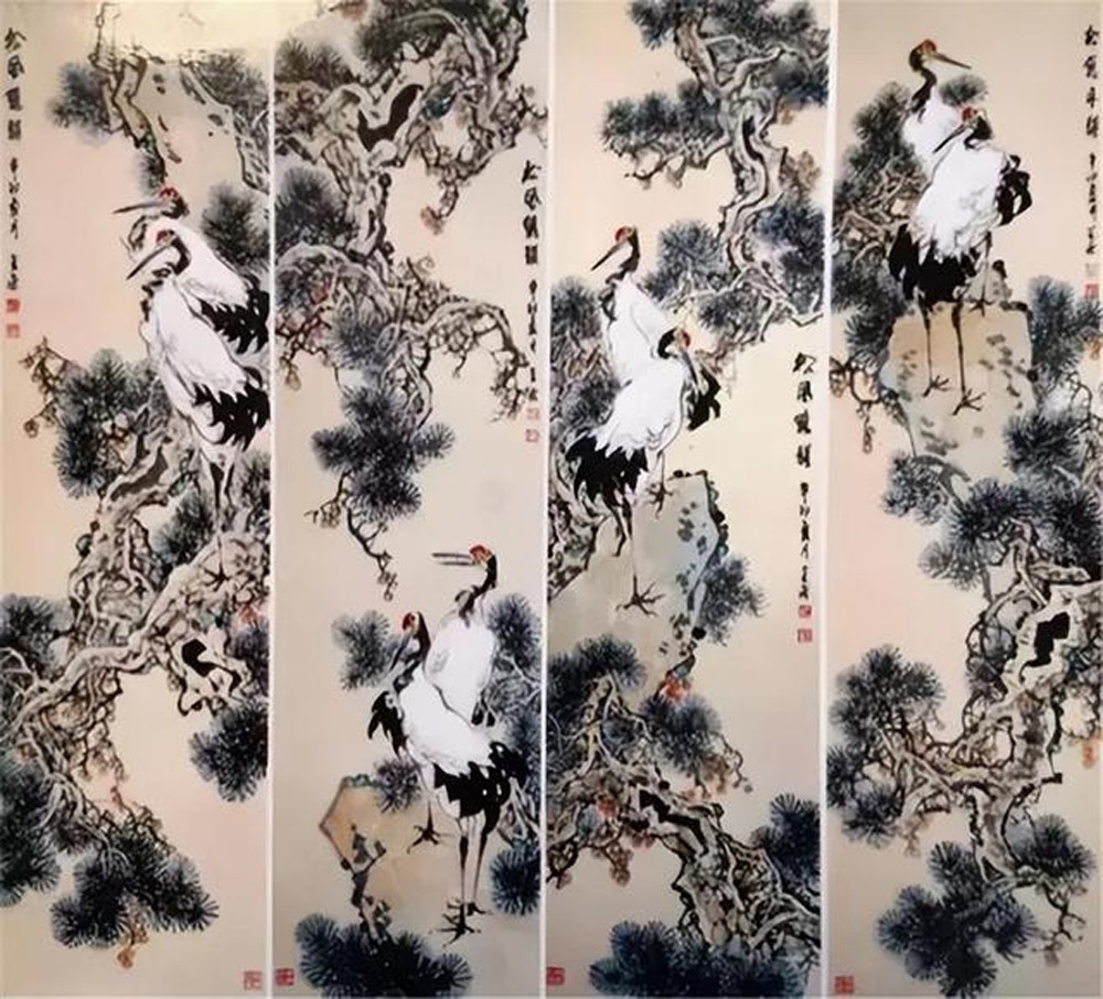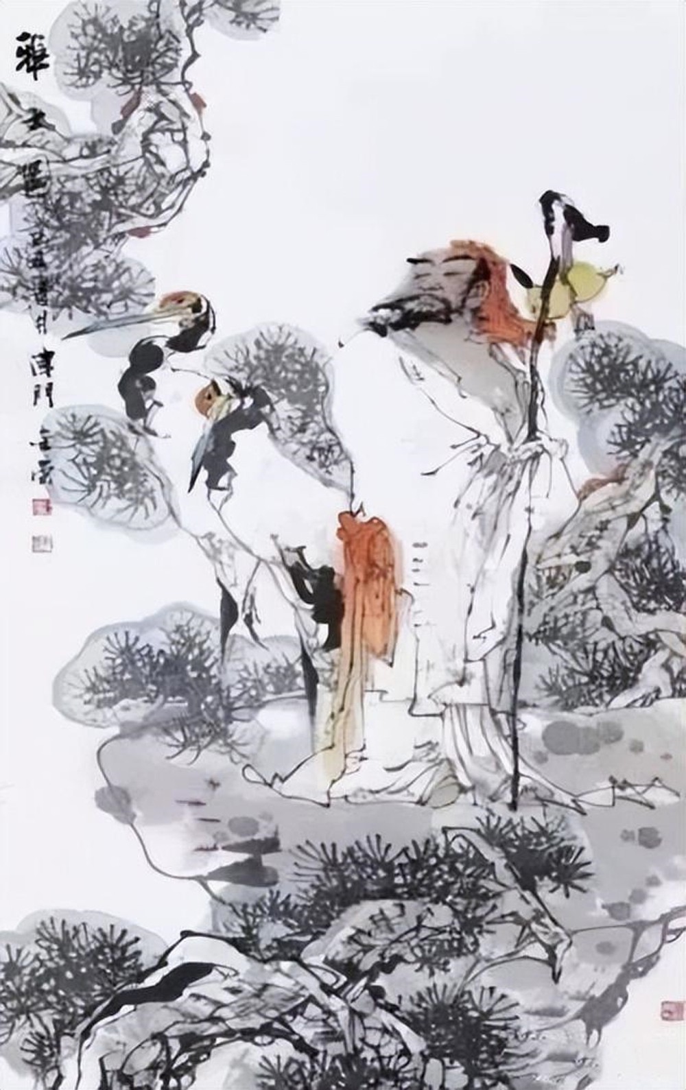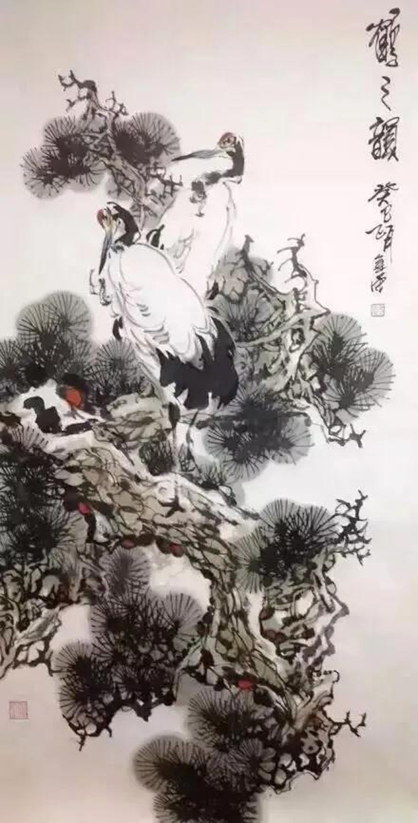 两只仙鹤栖息在松树的主干上,勾画出了人们喜闻乐见的通俗题材-健康长寿,松鹤延年。在造型刻画上,仙鹤神情安定,胜似闲庭信步,给人一种与世无争,泰然处之,安居乐业,幸福美满的感觉。最值得一提的是整个画面线条老辣而又苍润,不出干笔,多以湿笔运行,所以感觉流畅、滋润,有韵律在舞动,你的心情也会随之荡漾。张金荣的国画,可以说是纯文人画。有着丰富的文化内涵,古朴、典雅、厚重、沧桑,饱含丰富的中国古典哲学。