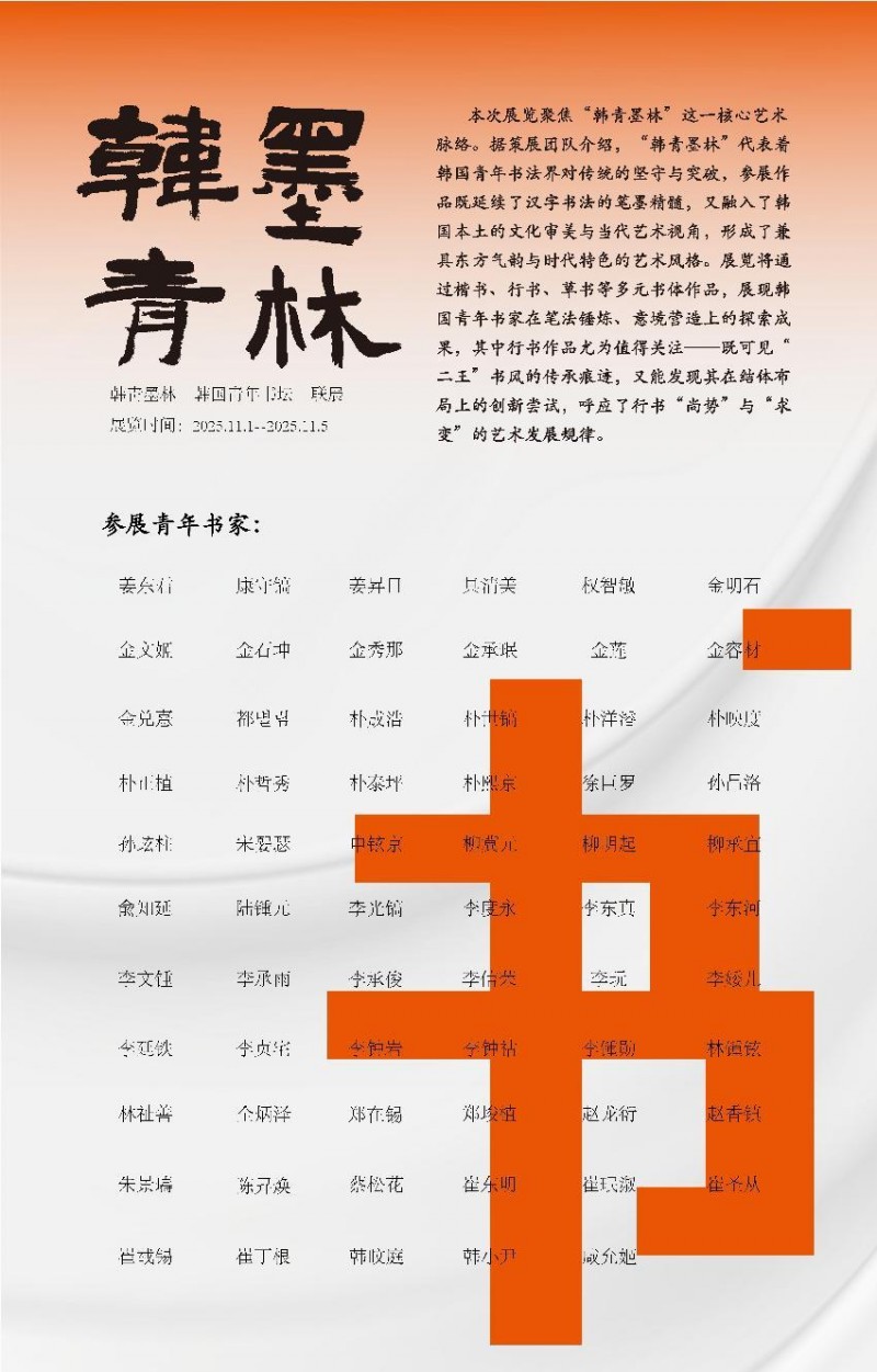 展览标题《韩青墨林》,寓含“韩国青年书家以笔墨汇聚成林”之意,象征青年艺术家以笔墨构筑自身艺术世界的历程,也喻示他们的作品共同形成一片郁郁葱葱的艺术森林。此外,这片“墨林”不仅代表作品的集合,更象征着韩国青年书坛与韩青书脉两个团体志同道合、共同成长的深厚情谊。
