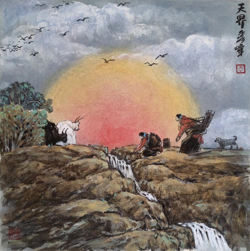 最动人的,是她山水中的“人味”。不同于传统山水画中“人如芥子”的疏离,李秀峰的山水里,人物从不是点缀,而是山水的灵魂。牧民策马奔腾,马蹄踏碎草原的寂静;老者静坐坡前,目光与远山相融,仿佛在与天地对话。人物的姿态舒展自然,与山石、草木、流云相映成趣,没有丝毫违和。她以细腻的笔墨勾勒人物的神情,又以磅礴的气势铺展山水的辽阔,一细一阔间,道出了“天人合一”的东方哲思——山水滋养人,人亦赋予山水生机与温度。