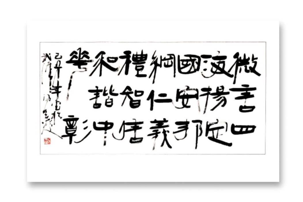 “艺术家的创作应根植于社会文化需求,且需与人民喜闻乐见相对应。”他说,“比如书法,格言警句,优美古今诗文都是我们创作的素材。但不是机械描字,做字,抄袭字,要用架构包括章法,线条,韵律,以及黄金分割率等与书文有机结合,传递发扬文章内涵。”