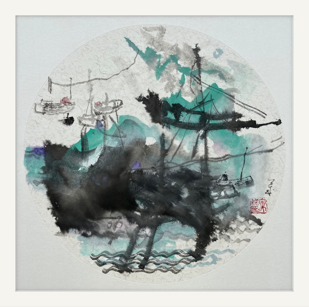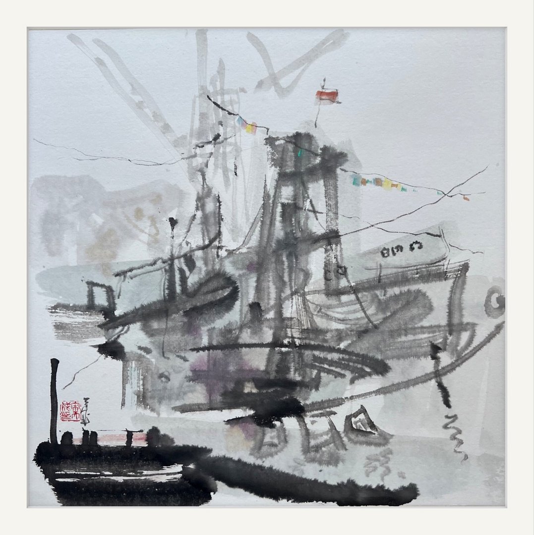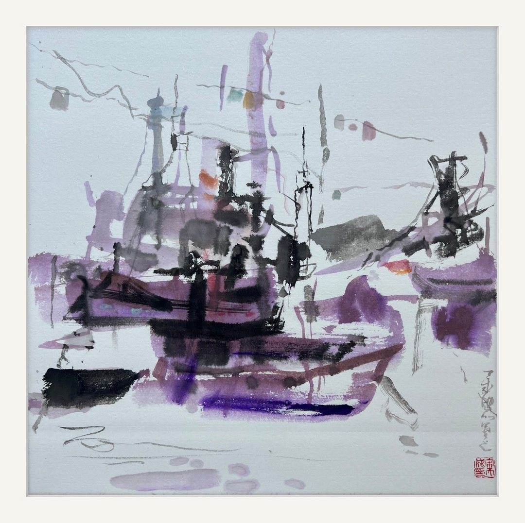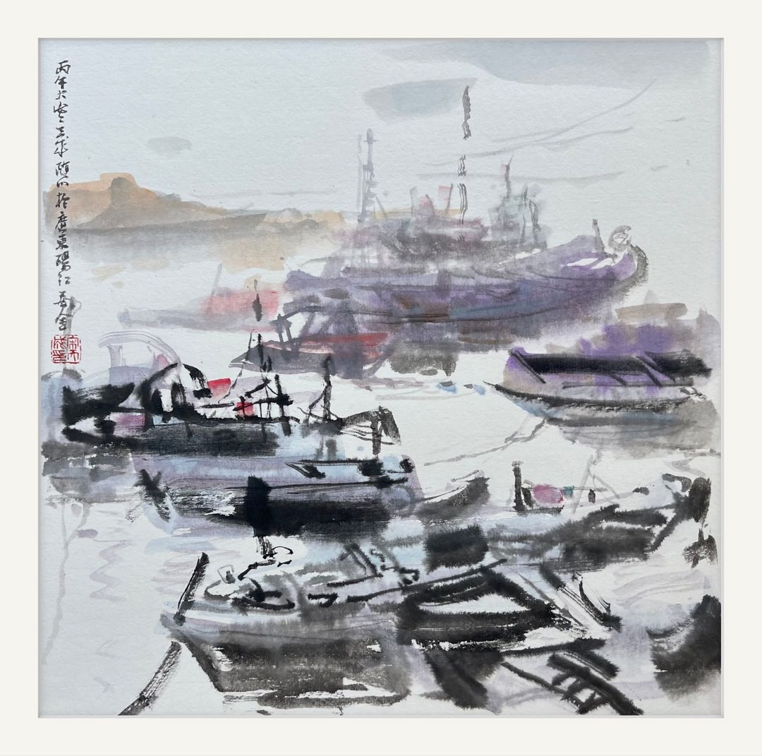 船舰交错重叠、竞相延展,钢架高低错落、形色妖艳,桅杆鳞次栉比、形如利箭,缆绳六色五颜、纵横纠缠;浪花乱飞,光照四溅,马达轰鸣,笛声震天;渔歌悠闲,哨音袅艳。每一艘舟楫,每一根桅杆,每一方舵盘,每一个渔人都成为了这片海域不可或缺的构件。然而,只要你屏心静气,就会发现如此“混沌”中竟然裹挟着某种超乎寻常的能量,亦或一种蓬勃向上的生命活力。是的,这种“乱”并非真乱,而是一种清亮的混沌,一种包蕴着无限可能的动态平衡与让人诧异于凌乱的和谐之美。假如你是艺术家,你还会看到波涛上每一个音符是如何被秩序定格,每一个影相是如何被结体,每一个色域之间的负空间是如何被赋能的。这些色块、音符、影相并未被禁锢于你的画面,它们只是很安静地排列在那里,似乎有一双大手紧紧拽住流动的空气,把眼前移动的一切稳稳当当安放在各自应有的位置。这种空间静默中的张力,让你感觉它们会由内而外爆炸开来,把眼前的一切连同你的灵魂碎裂成飘渺的虚空。其时,一个声音还会告诉你画面之外不在场的正在为如此场景的展现提供更多潜质的能量支撑。