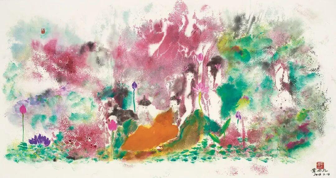 叶向礼先生的荷画系列,既有着国画的笔性之艺,也加入了五彩缤纷的光彩之美,这类画在光的映影下,便如有着西方印象派大师莫奈的睡莲之图像美。这无疑是画艺的拓展与心灵感受的碰撞之果,也必然是这个美好时代中的一束艺术本相O