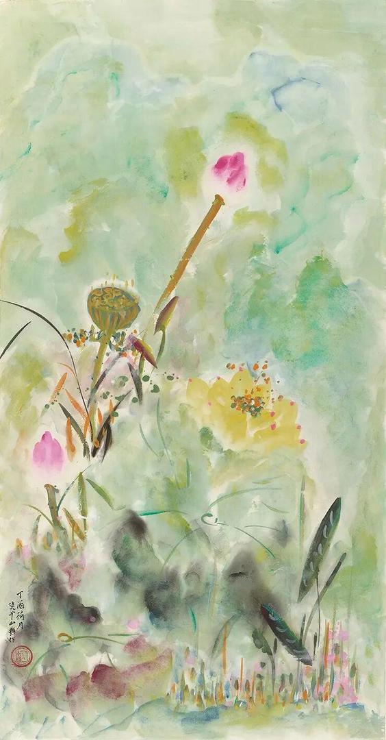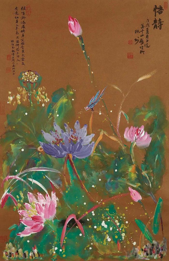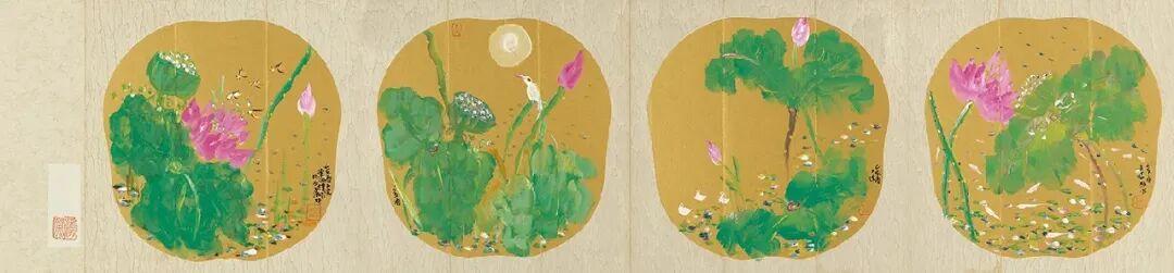 他和夏荷做深深地对话,又奔放地在炎热的阳光下画夏荷的歲蕤,是人的精神和大自然“映日荷花别样红”的相呼相映,这种西湖盛夏之美是炙热的、洋溢的,亦为神飞的。于是画的多彩变换是阳光移动和水波流动的交响乐,也是我们这个盛世时代的一份大美写照。