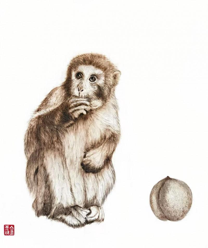 《金猴献瑞祝期颐》是融恩老师为父亲70大寿精心打造的贺礼,也是其烙画艺术的代表作。作品以“灵猴献桃”为核心题材,通过扎实的烙画技艺,将猴子的灵动神态、蓬松毛发刻画得栩栩如生,桃实饱满圆润、纹理清晰,传递出“金猴献瑞、福寿绵长”的美好祈愿。