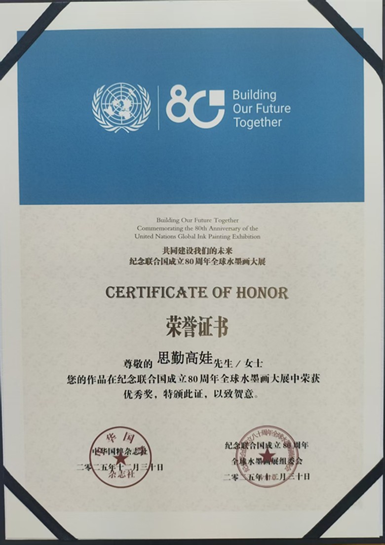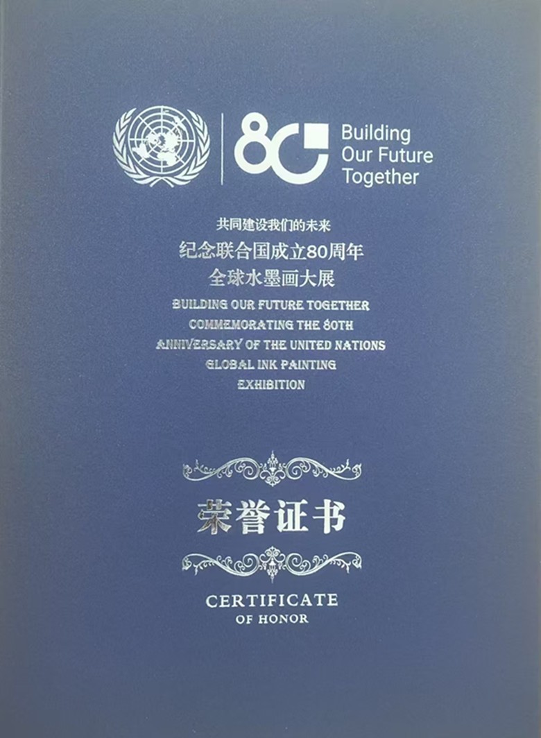 获“纪念联合国成立八十周年全球水墨画大展”优秀奖荣誉证书