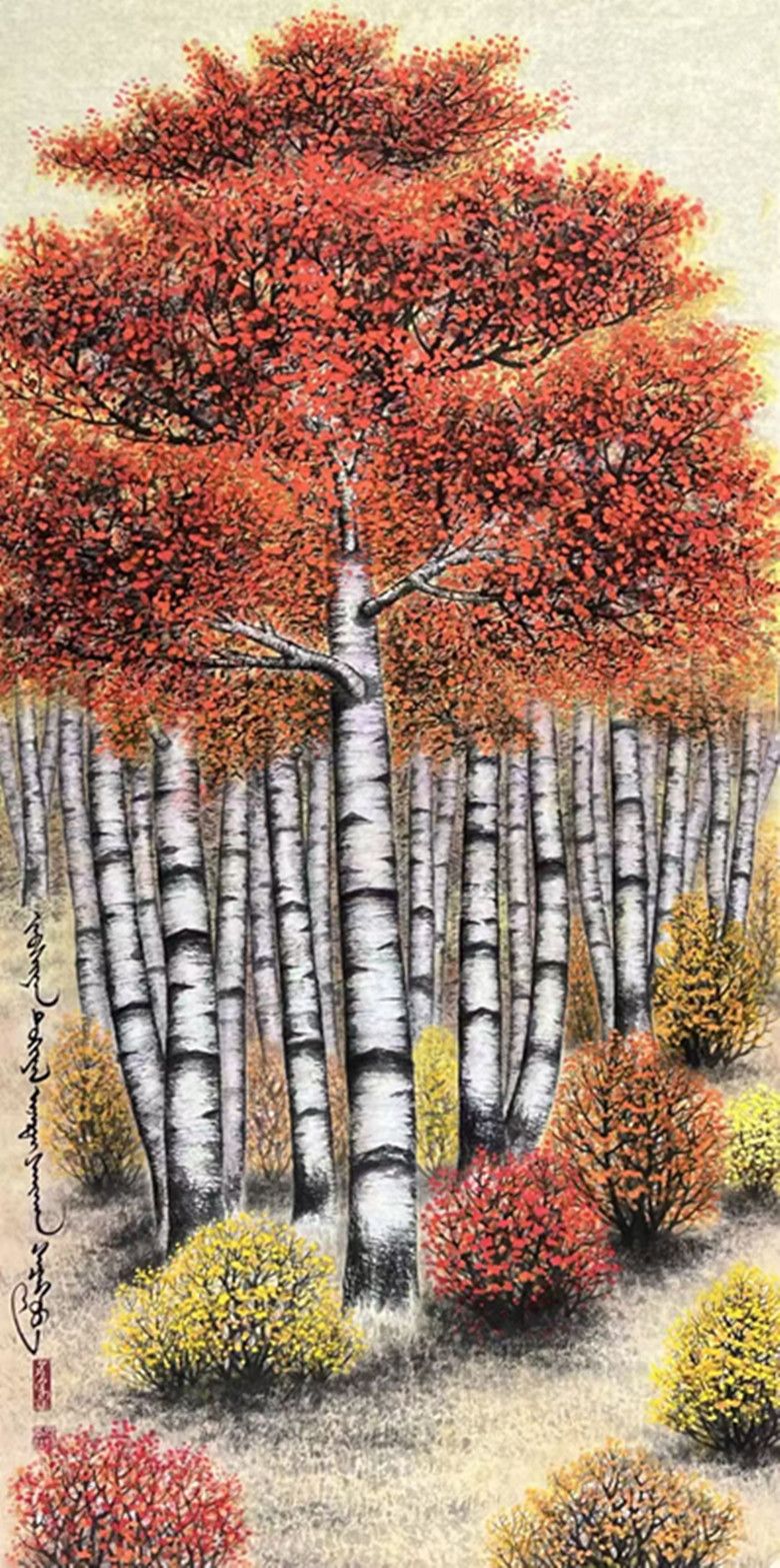 思勤高娃这幅作品以极具辨识度的白桦林为主体,将北国秋韵的热烈与清劲融为一体。画家以浓艳朱砂点染红叶,层次饱满、疏密有致;以劲挺线条勾勒白桦树干,黑白纹理刻画细腻,尽显林木肌理之美;前景黄红灌丛错落排布,为画面增添了丰富的色彩层次与空间纵深感。笔墨间兼具工笔的细腻与写意的雄浑,既还原了白桦林的自然之美,更赋予了作品山河壮阔的艺术格局。