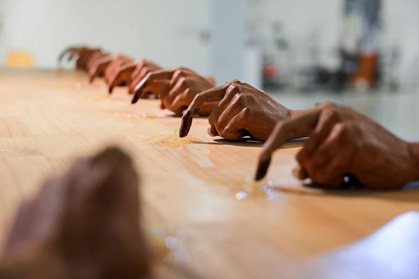 苗佳蔚《一百个人的孤独》 大漆、黏土、沙土、钢筋 600cm×30cm×700cm 2025年