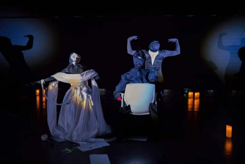 创作层面,侯莹珏导演坚守自由创作初心,摒弃同质化套路化表达,确立以原创心性主义解构人性为核心创作理念。创作中突破性融入电影化蒙太奇叙事手法,令舞台张力与诗意意境相融共生;以清冷东方美学融合极简哥特风格为视觉基底,结合凛冽人性思辨,层层铺展悲剧背后深沉的宿命内涵,营造出克制又极具冲击力的艺术氛围。剧目采用四幕倒叙先锋结构,依托铺满全场的沉浸式光影设计为核心叙事载体,搭配黑色面罩、黑色手套、黑红法袍等强符号化舞台意象,循序渐进外化角色欲望、精神挣扎与灵魂沉沦,以东方当代视角重构莎翁经典,赋予古老悲剧全新的当代艺术表达。