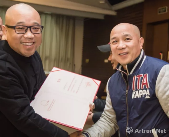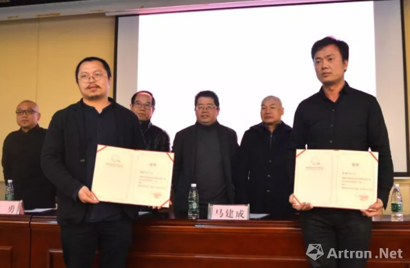 新当选主任黄兴勇、谭建明为专委会理事单位(左起):禾马(湖南文化产业发展有限公司)、湖南袁木商业运营有限公司、长沙楚拓雕塑有限公司授牌。